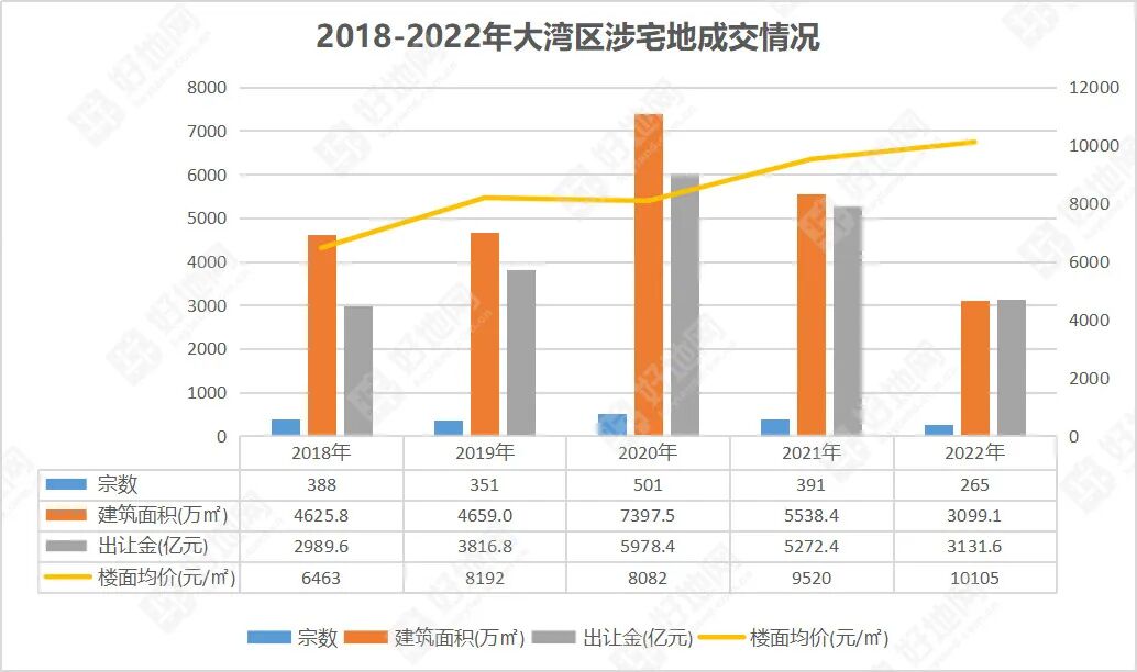 好地网12月30日消息(研究员 黄卓贤)据好地大数据,大湾区2022年全年共成交涉宅用地(住宅、商住、租赁住房、人才房、安置房用地,下同)265宗,总出让金额3131.6亿元,同比去年(5272.4亿元)减少2140.7亿元,降幅40.6%。
