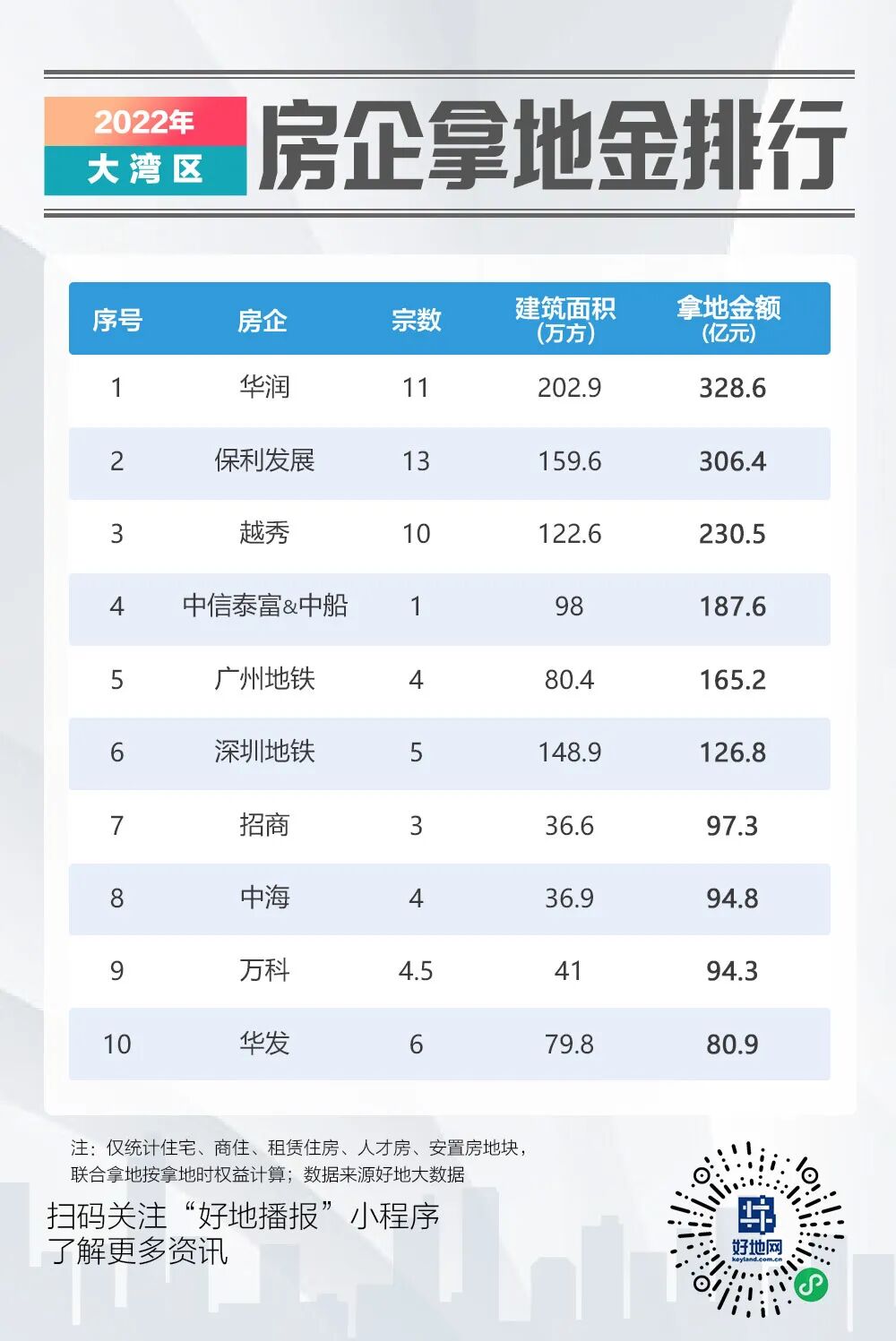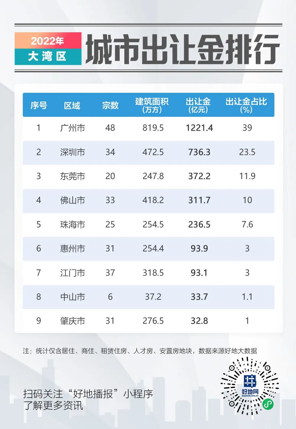 2022年,城市出让金排行榜首位广州市,总出让金1221.4亿元,占大湾区出让金的39%。