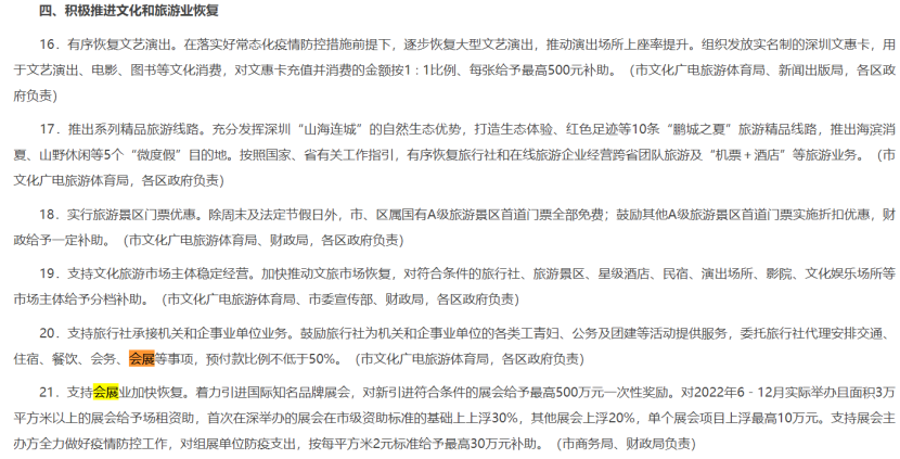 2022年7月6日,深圳印发《关于扎实推动经济稳定增长的若干措施》,其中,提出支持会展业加快恢复,着力引进国际知名品牌展会,对新引进符合条件的展会给予最高500万元一次性奖励。