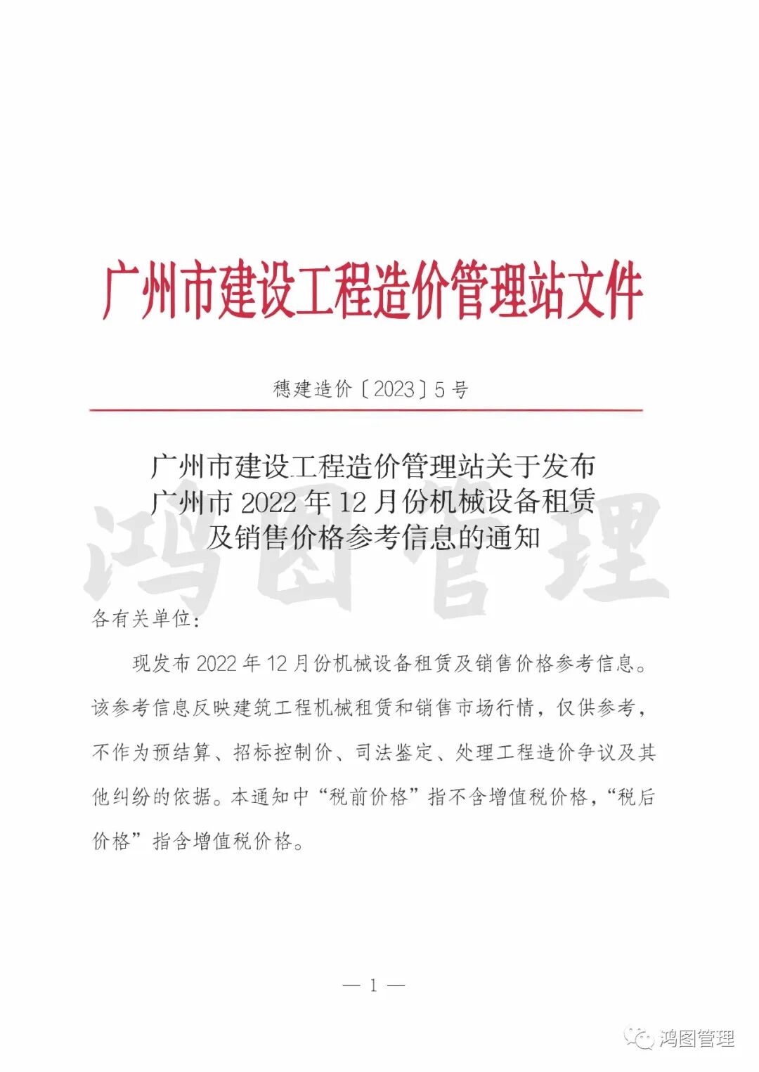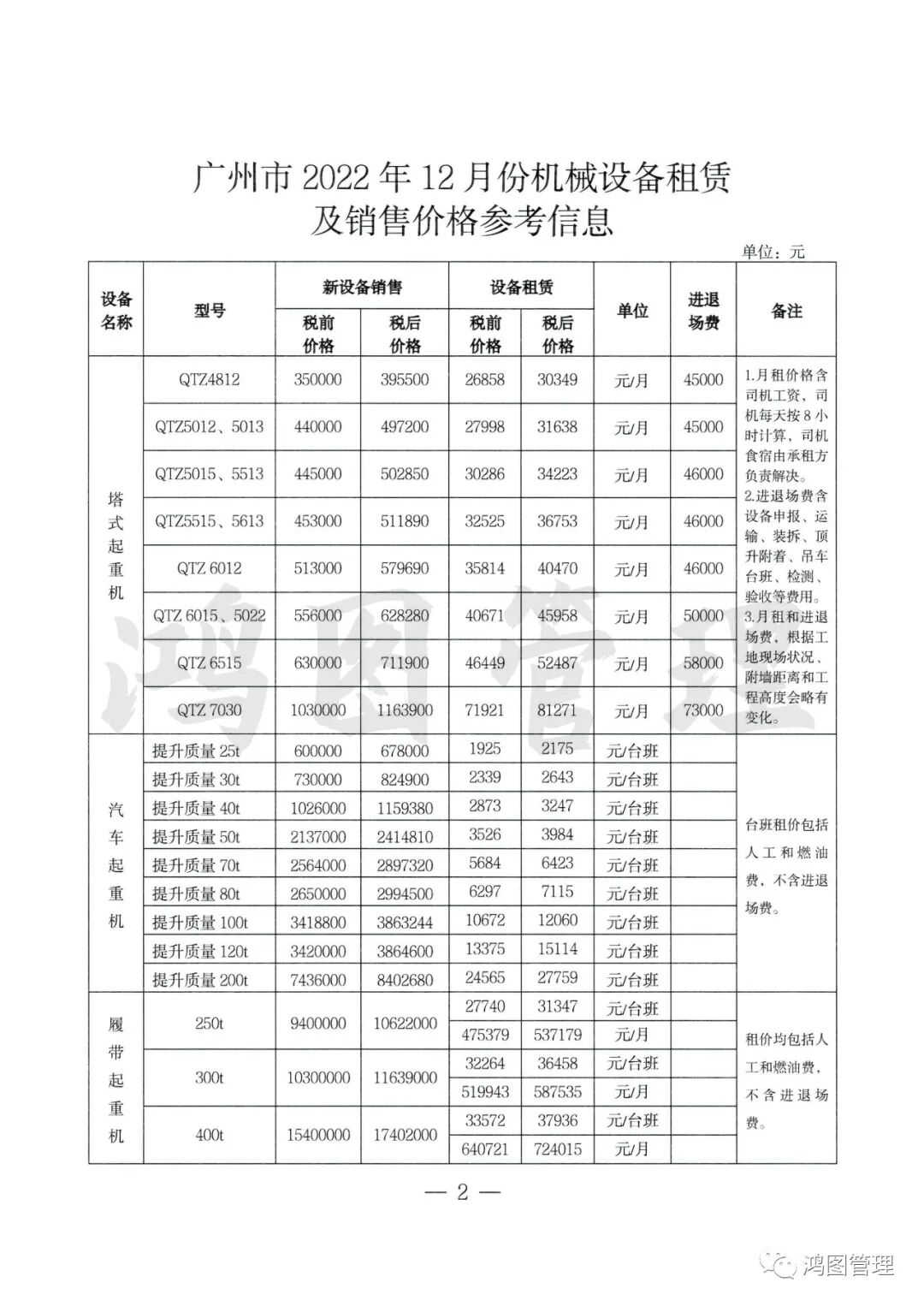 现发布2022年12月份机械设备租赁及销售价格参考信息。该参考信息反映建筑工程机械租赁和销售市场行情,仅供参考,不作为预结算、招标控制价、司法鉴定、处理工程造价争议及其他纠纷的依据。本通知中“税前价格”指不含增值税价格,“税后价格”指含增值税价格。