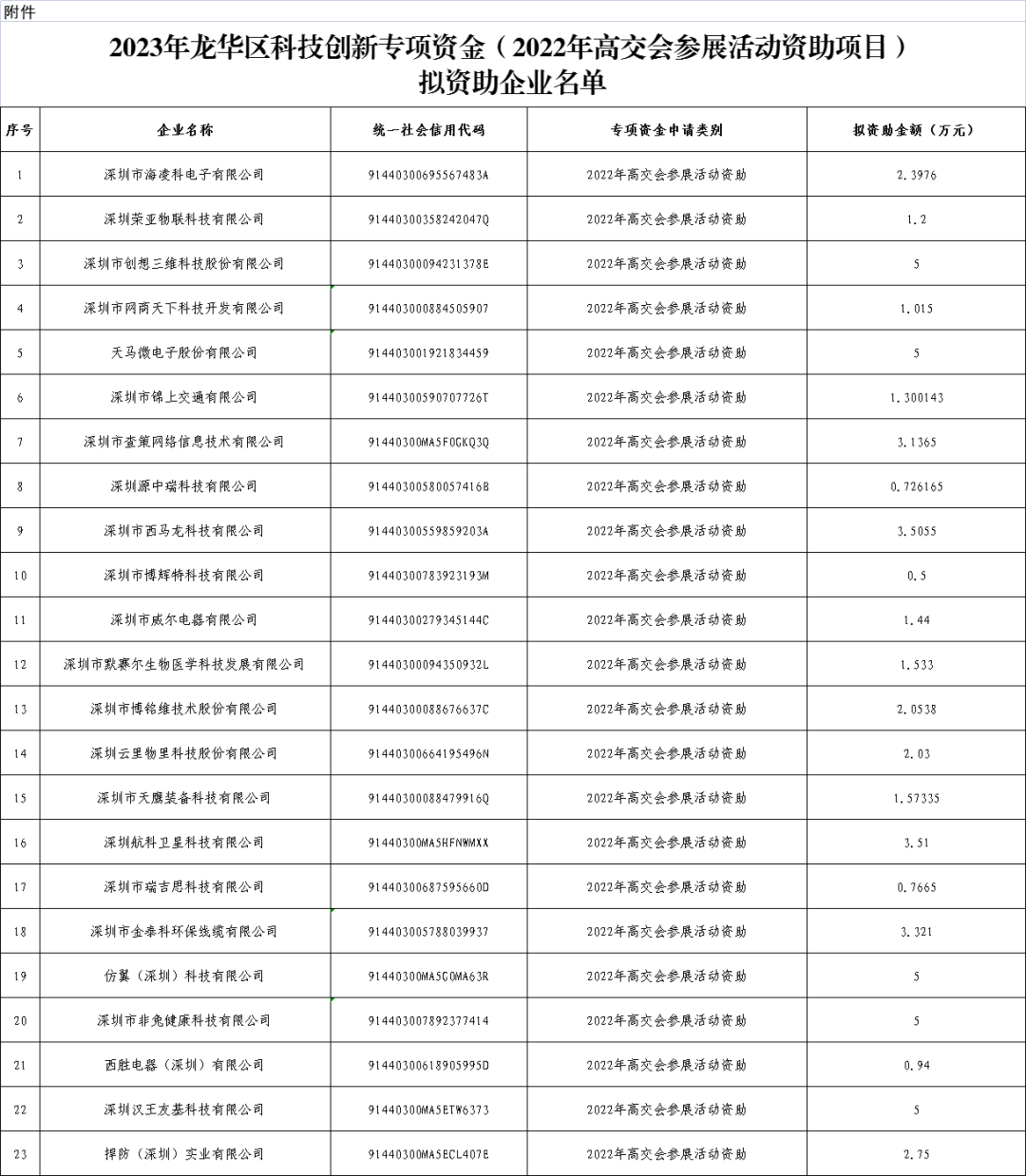 附件:2023年龙华区科技创新专项资金(2022年高交会参展活动资助项目)拟资助企业名单