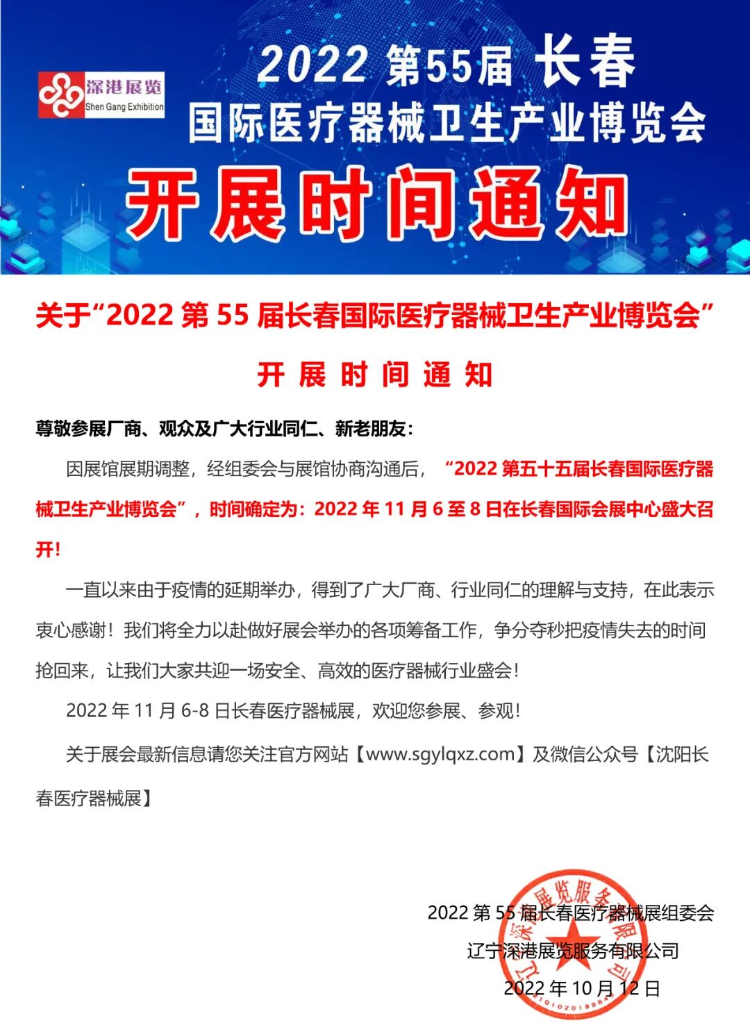 因展馆展期调整,经组委会与展馆协商沟通后,“2022第五十五届长春国际医疗器械卫生产业博览会”,时间确定为:2022年11月6至8日在长春国际会展中心盛大召开!