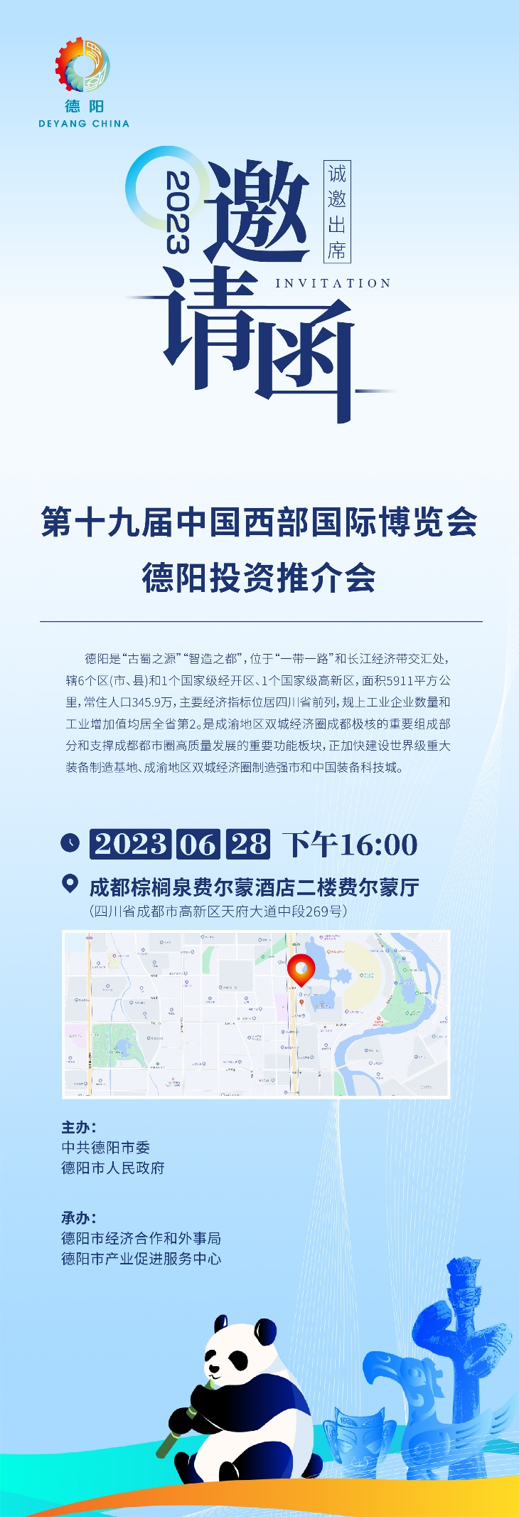 第十九届西博会将以“中国新时代·西部新征程”为主题,于2023年6月29日至7月3日在四川成都中国西部国际博览城举办。我市拟借助西博会,于6月28日在成都举办投资推介会。特邀请有意向到德阳投资的会员企业参加。