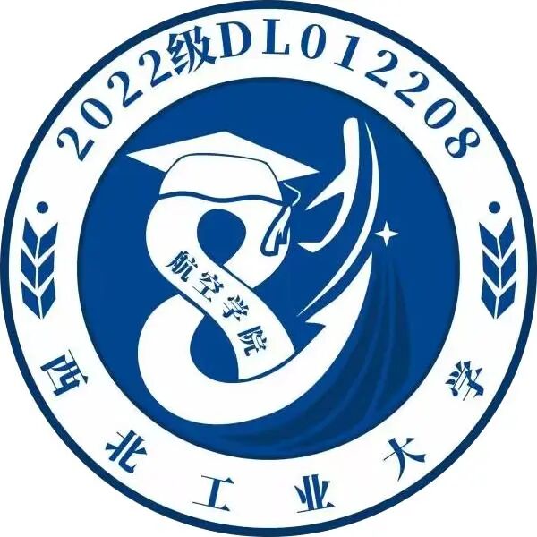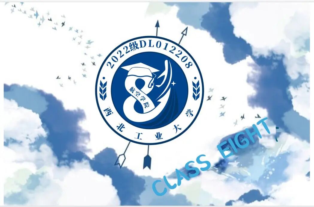 班徽整体为蓝色和白色,寓意广袤天空,学士帽寓意博学,8字尾的飞机寓意翱翔代表八班;外圈两旁的箭头寓意我们属于西北工业大学。班徽整体代表着8班人将牢记工大校训,以工大为荣,博学笃志,展翅翱翔。
