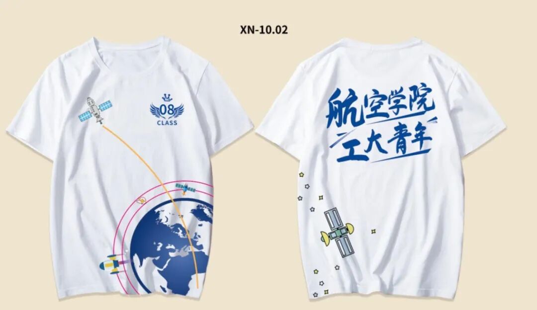 航空学院,工大青年,星辰大海,宇宙航行。班服结合航空航天两方面特色,符合了航空航天大类专业的要求与特点。08的徽标上带着的小翅膀,寓意我们终有一天会启程,一起向未来。