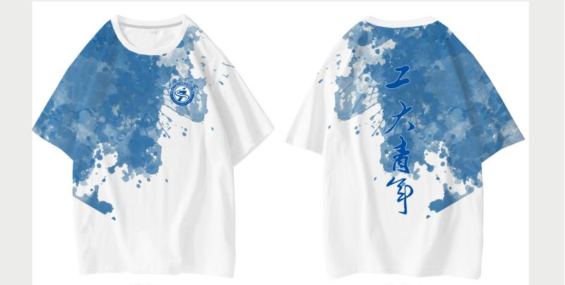 班服左上角为班徽和校名,背后为毛体“工大青年”四个大字,体现了同学们作为工大学子的骄傲,右肩上蓝墨水渲染,更凸显了同学们作为新时代青年的活力。
