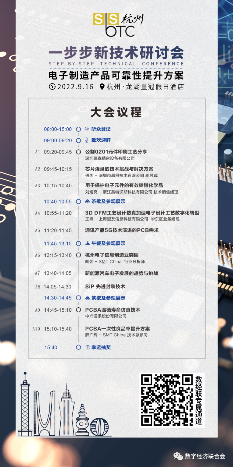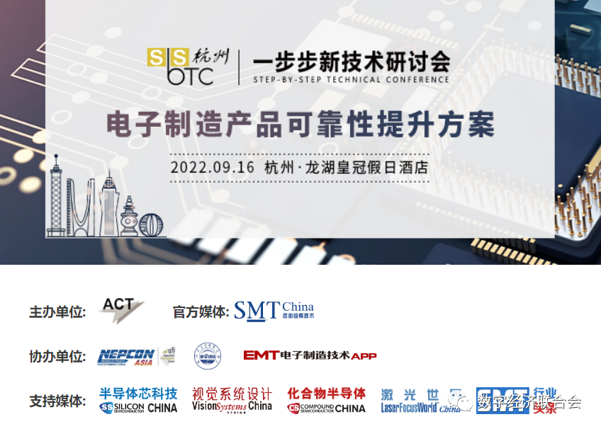 9月16日,“一步步新技术研讨会”将以《电子制造产品可靠性提升方案》为主题在杭州龙湖皇冠假日酒店进行单场研讨会,探讨在智能制造之下,传统的制造流程如何重组来完成智能工厂现代化转型,同时搭建贸促平台,加快全产业链集聚。届时来自杭州及长三角的技术人士将齐聚一堂,聚焦智能制造,共享开放创新。本次研讨会是一步步新技术研讨会第七次在杭州办会,杭州数字经济联合会作为协办单位,诚邀各优强企事业单位代表参加。