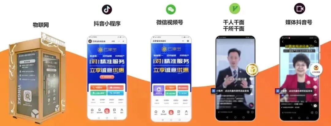 通过物联网+新媒体+视频技术,结合AI分析、区块链等新兴科技手段,全渠道覆盖新媒体、触摸机的小程序、微信源生、移动SDK/H5开发,全场景覆盖咨询平台开发、管理后台开发、消息模板及日志开发、多端口信息同步机制、法律问答知识库、区块链合约等。通过点对点铺设“AI无人律所空间站”至省、市、区县的社区(村)、园区区域及偏远地区,还可以通过手机扫描二维码、抖音视频、微信视频号等新媒体端口关联律所专属【千所千面】及律师专属【千人千面】链接,随时随地触达法律服务。本平台以盈科律师事务所为背书,结合国家三级等级所要求的近300项要求下,是严格按照国家要求保护客户隐私安全、数据安全及运营安全的。