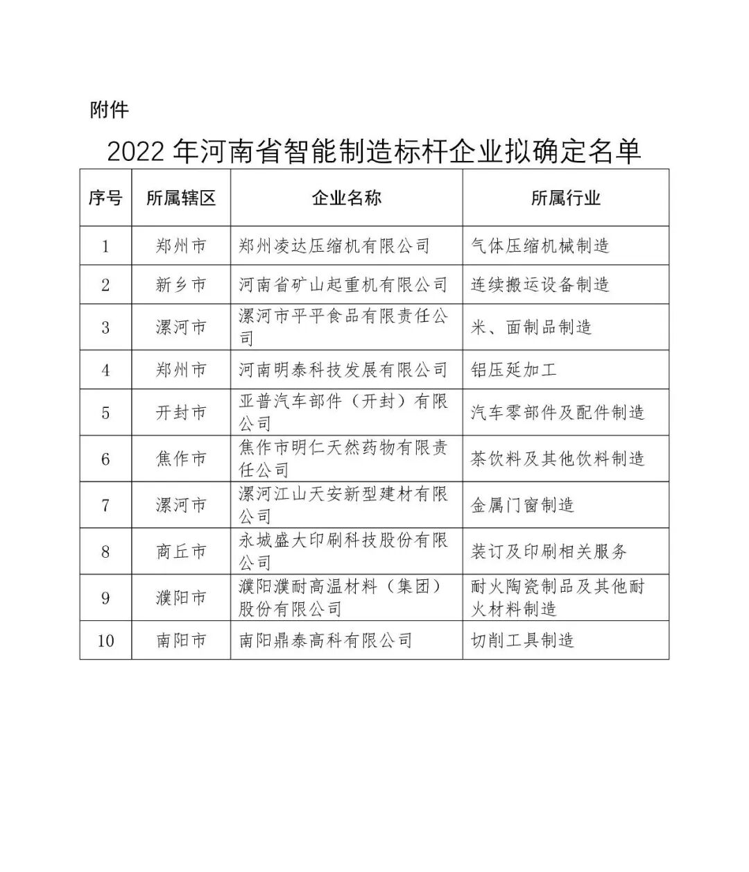根据《河南省工业和信息化厅办公室关于开展2022年智能制造标杆遴选工作的通知》(豫工信办数字〔2022〕187号)工作安排,经各省辖市、济源示范区、航空港区工业和信息化主管部门推荐,省工业和信息化厅组织专家进行评审,拟确定郑州凌达压缩机有限公司等10家企业为2022年河南省智能制造标杆企业,现予公示,接受社会监督。如有异议,请以书面形式向省工业和信息化厅反映。