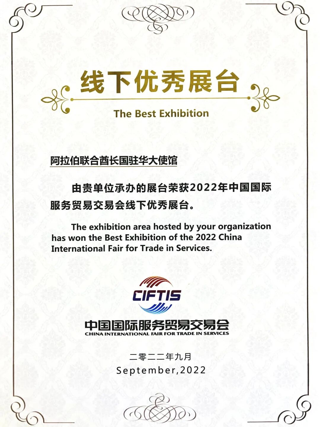 阿联酋驻华大使馆荣获2022年中国国际服务贸易交易会颁发的“线下优秀展台”奖。去年,阿联酋以主宾国身份参加2022年中国国际服务贸易交易会。阿联酋是中东及北非地区首个受邀担任服贸会主宾国的国家。在服贸会期间,阿联酋馆对航空、经济和金融、石化能源、金融服务、先进工业部门以及文化旅游等进行展示,全面呈现阿联酋服务贸易领域的最新发展。来源:阿联酋驻华大使馆备注:图源网络,图片版权归原作者所有,仅作分享之用,引用不作盈利性用途。如分享内容侵犯版权或者所标来源非第一原创,请私信小编,将及时审核处理。点分享点点赞点在看