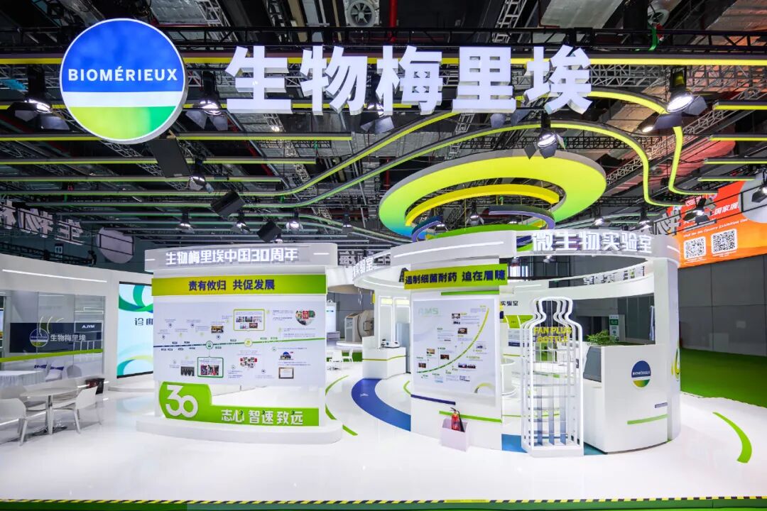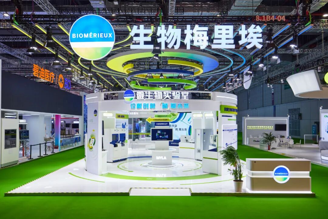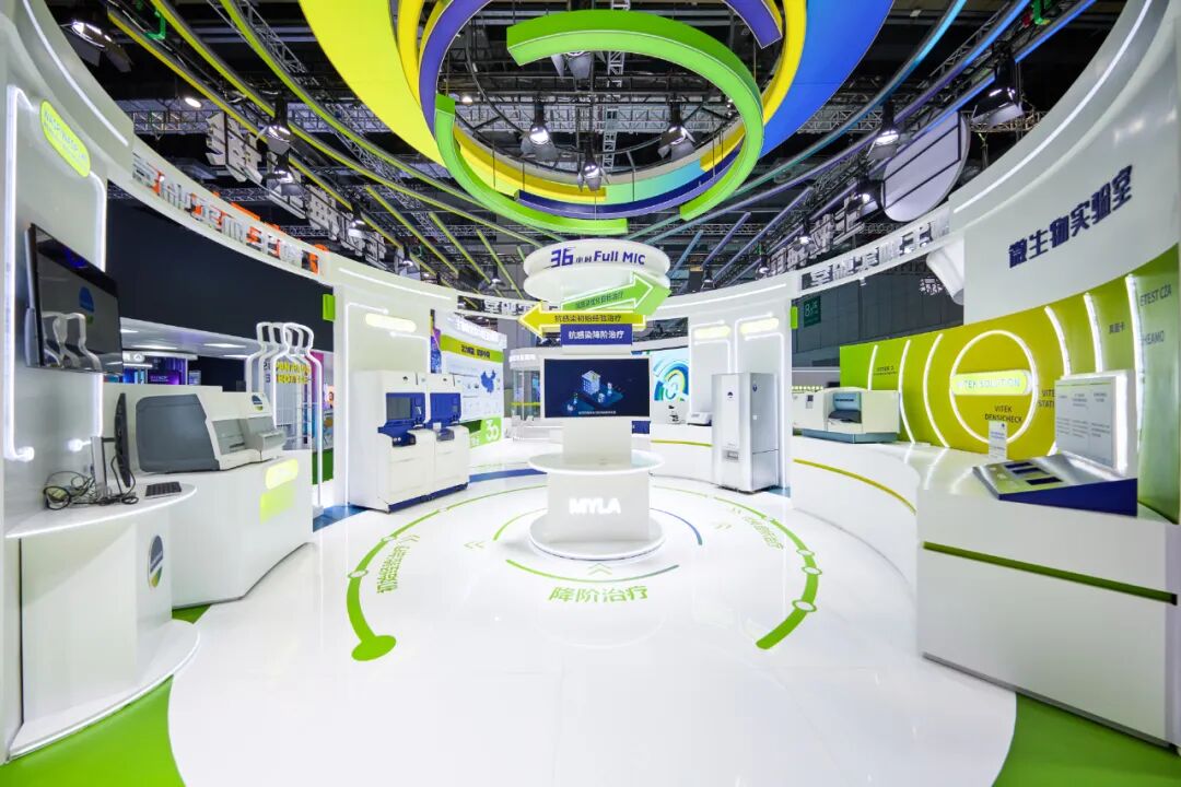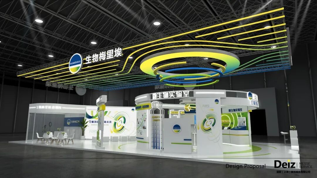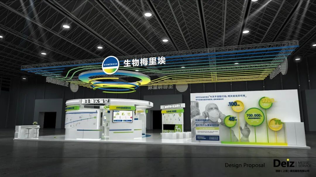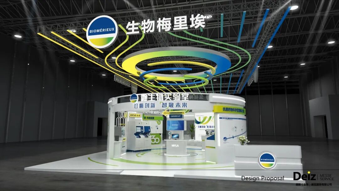 此次进博会,生物梅里埃以【诊断创新,“智”敬未来】为主题,充分将其在抗微生物药物的科学管理与精准使用的研究成果展示给大家。针对这一命题,德致展览围绕【微生物实验室】展开整体设计,环状的实验室与顶部螺旋上升的圆形结构相呼应,同时搭配品牌标志色的流水灯带,让游客在参观其全流程解决方案的同时,感受到这次品牌参展所传递的“让生命永续,人类生生不息”这一愿景。