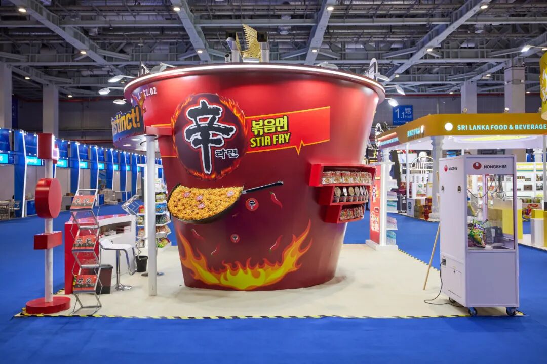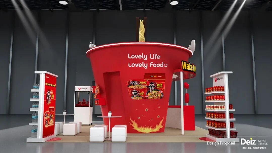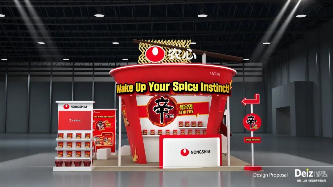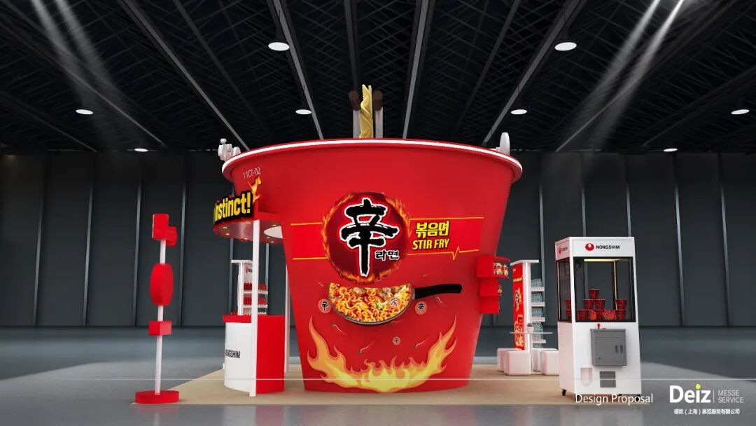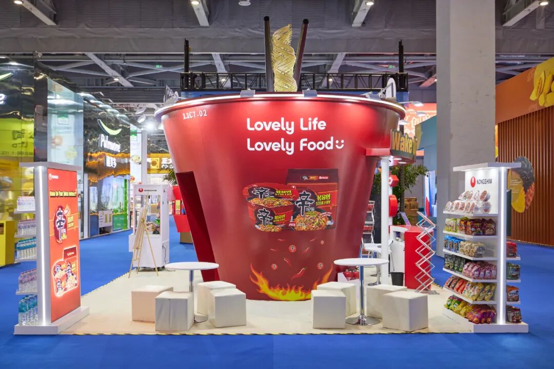 本届进博会,农心食品一共展示10个SKU产品,涉及辛拉面/辛拉面非油炸/辛拉炒面等,秉持“Lovely Life,Lovely Food”的经营理念,辛拉面口味得到了国人的认可。展台布置试吃台、泡面娃娃机体验,及3D立体面条展示,增强互动性和趣味性,吸引了不少美食爱好者竞相参与。