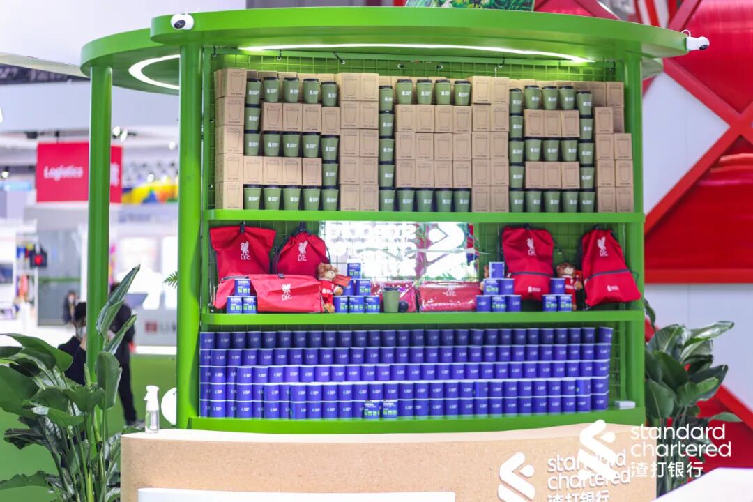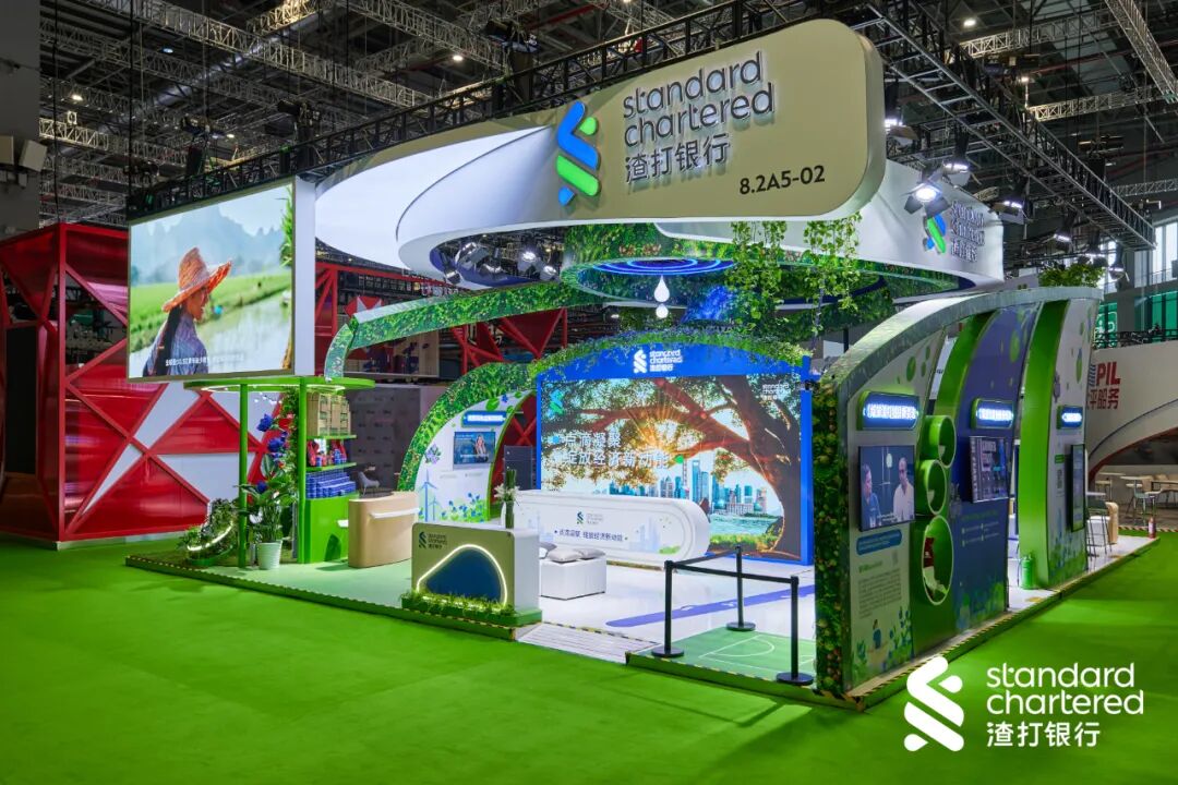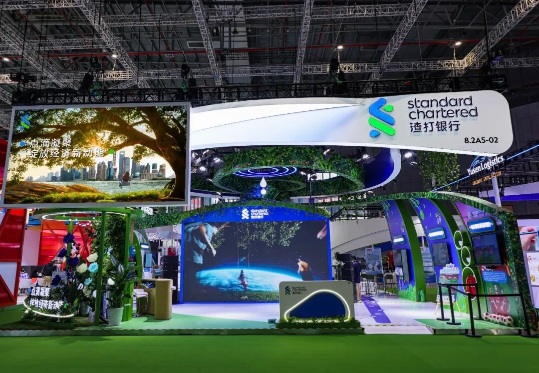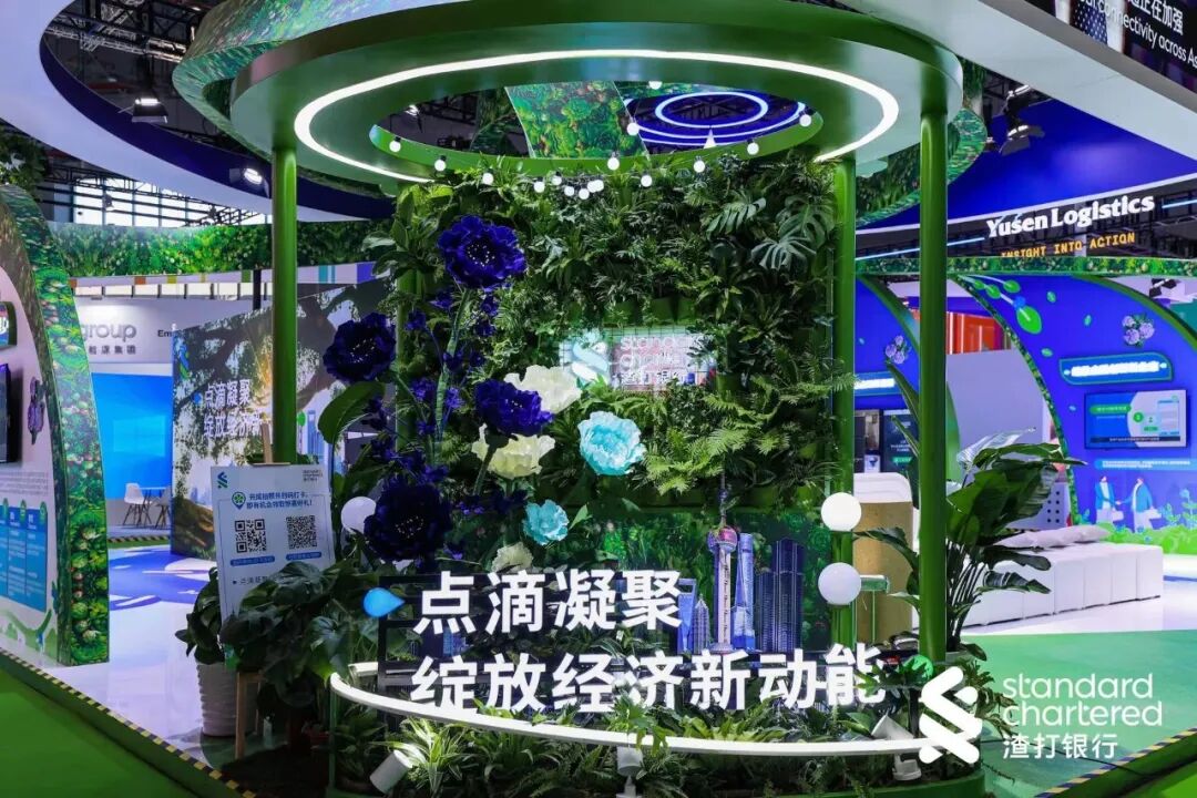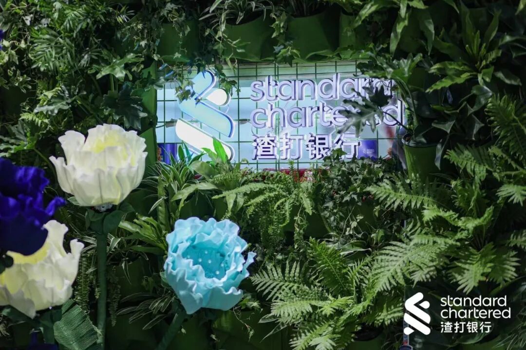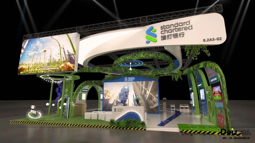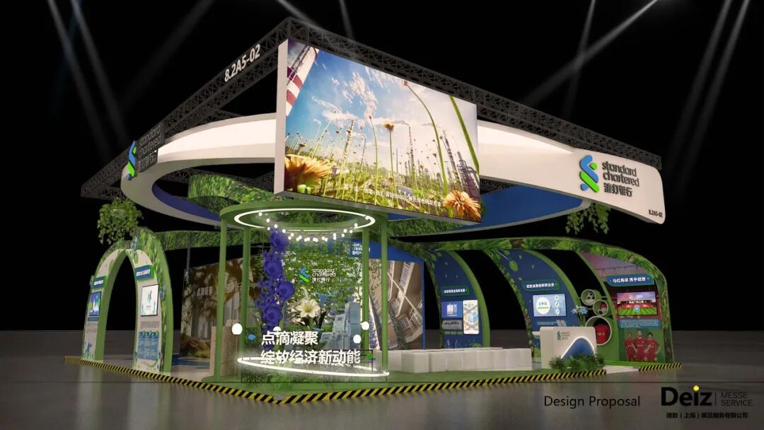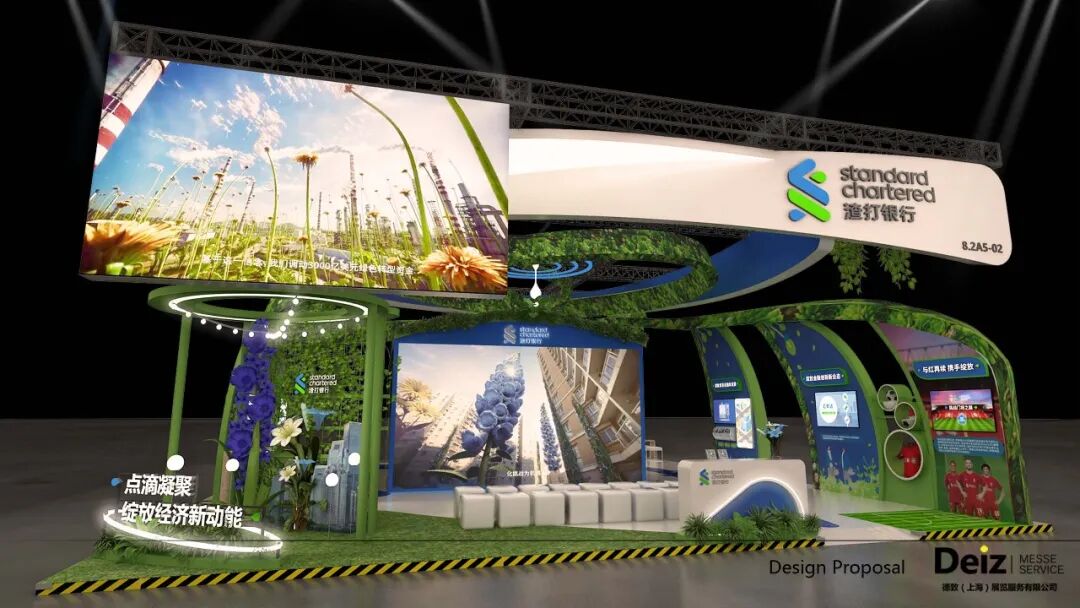 本次渣打银行进博会的展台主题为“点滴凝聚,绽放经济新动能”。从渣打银行品牌元素出发,以“润泽、生长、绽放”作为展台设计主线,以“城市森林”作为视觉核心,以代表蓬勃生机的绿色为主基调,以渣打品牌色中的蓝色为辅,通过绿植、机械花打造森林感,搭配展板金融业务线内容的打造城市感,营造多维立体的展台空间,多重角度展现绿色生态的人与自然之美,人与社会发展和谐共生。(展台服务商:德致(上海)展览服务有限公司)