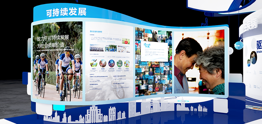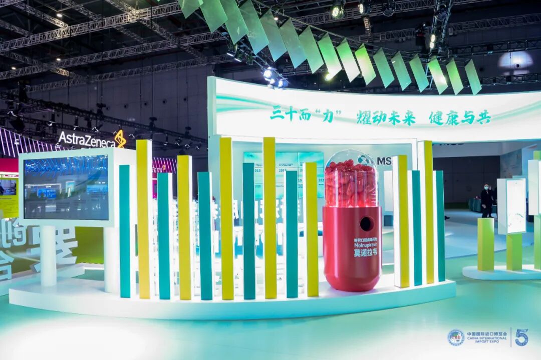 本届进博会上,默沙东展台达1000平方米,以奔赴“健康中国”宏伟目标的闪耀跑道为设计灵感,深度诠释了默沙东中国“耀动未来”战略的内涵及外延要义。入口处的数字“30”形状拱门,独具匠心地寓意默沙东进入中国三十周年里程碑。三条灵动的主题跑道“药之路”、“要之路”和“钥之路”,分别以“YAO(耀)”的不同谐音变体,诠释了“耀动未来”战略下“产品”、“患者(消费者)”、“客户”、“能力”四大支柱要务的在华进展成果,以及力争成为中国医疗生态系统中值得信赖和领先的合作伙伴、大力提升患者和消费者可及性、大幅改善健康结果的愿景。
