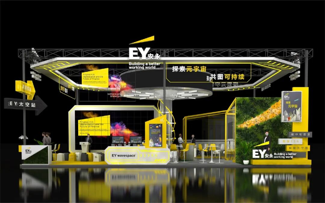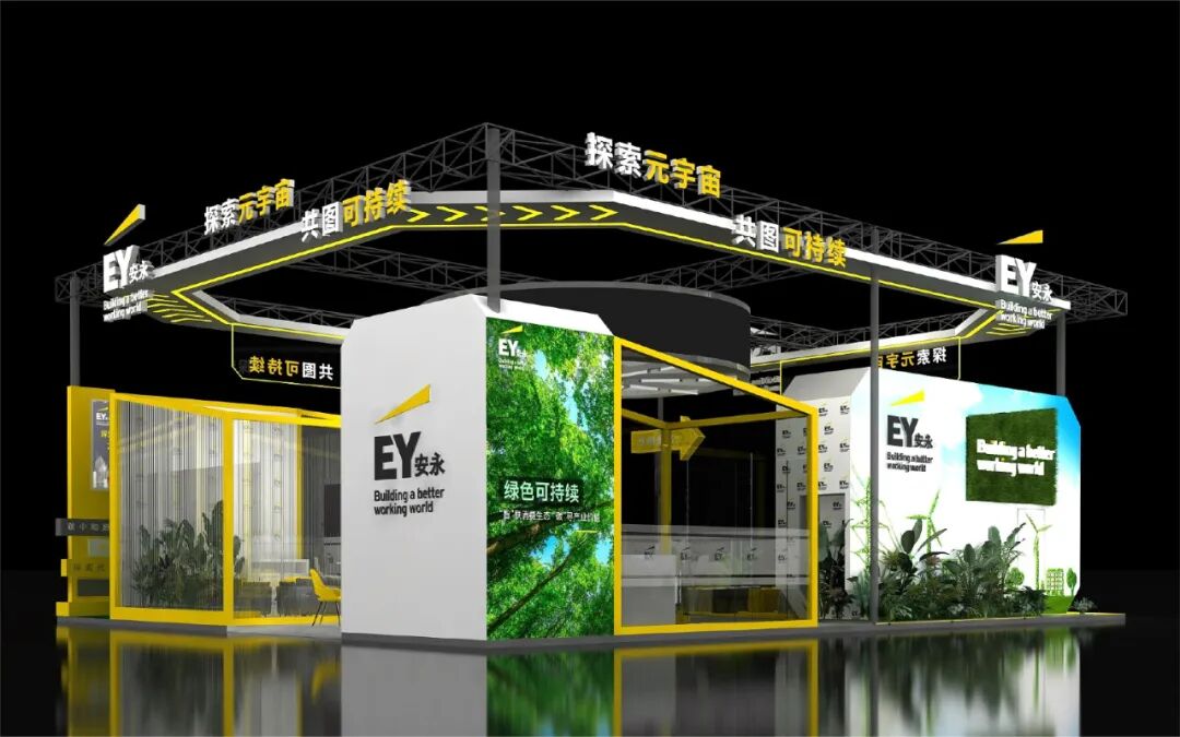 本届进博会安永展台设计将“元宇宙”主题与“绿色双碳”植物元素进行创意的碰撞与结合,构思新颖,令人眼前一亮。在巧妙运用宇宙空间站、太空补给站、宇宙空间轨道等概念,结合金属、镭射以及导光板等专业设计材料打造安永专属宇宙空间展台氛围感的同时,在特定区域还融入了形态各异的天然绿植创意造型设计。