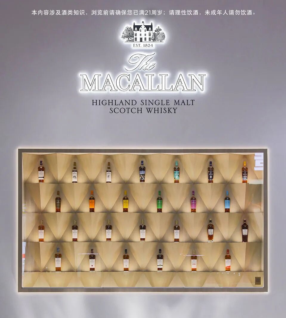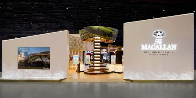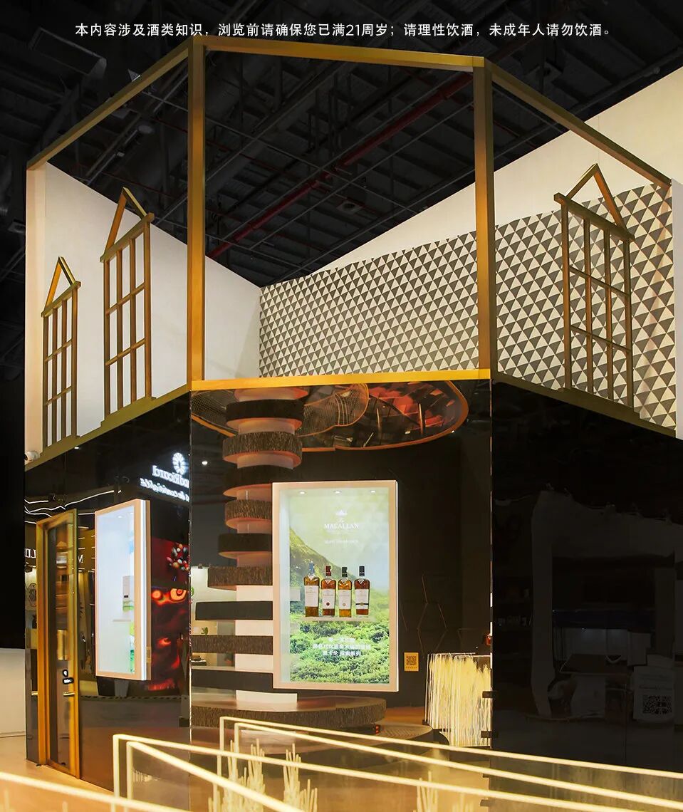 在第五届中国国际进口博览会上,麦卡伦品牌展台以几何美感的独特形制,牢牢吸引了往来观者的目光。展台的整体廓形设计以麦卡伦精神家园EasterElchies House为灵感,波光粼粼的外立面,令人联想到斯佩河的纯净灵动,搭配展台内金色的麦田装置,展现出麦卡伦诞生地独特的自然风貌。展台内盘旋上升的橡树时空,充满视觉震撼力,代表着品牌长期以来对雪莉橡木桶陈年的无比坚持,以及对木材卓越品质的追求。