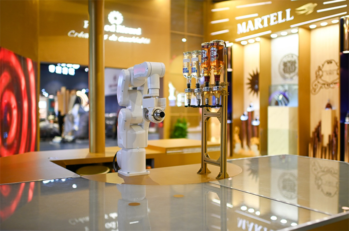 值得一提的是,此次展台设计更是融入创新性的可持续发展理念和实践。在设计巧思中,数百个马爹利空酒瓶被重新循环利用,通过包括清洗、破碎、辅料、烧制等多重复杂工序,制作成为展台的吧台桌面,有效延长废弃材料的“生命周期”。
