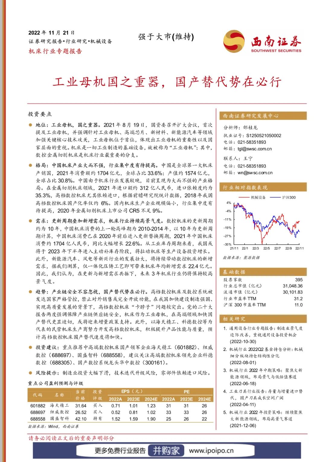 2021年 8月 19日,国资委召开扩大会议,首次提及工业母机,并强调针对工业母机、高端芯片、新材料、新能源汽车等领域加强关键核心技术攻关,工业母机位于首位,体现出工业母机的重要性以及国家层面的重视。机床是一切工业制造的基础设备,故被称为“工业母机”;其中,数控金属切削机床是机床行业最重要的分支。