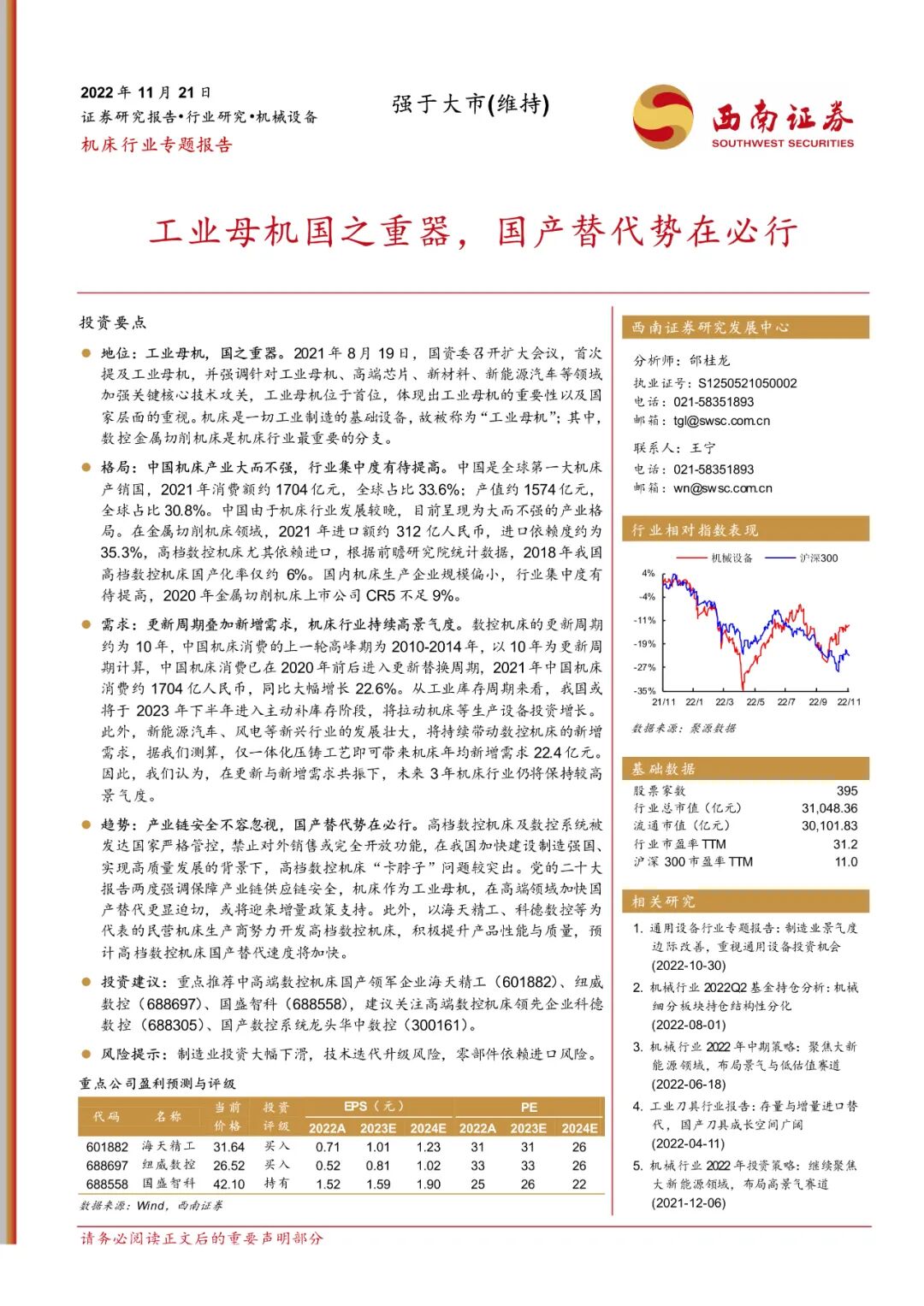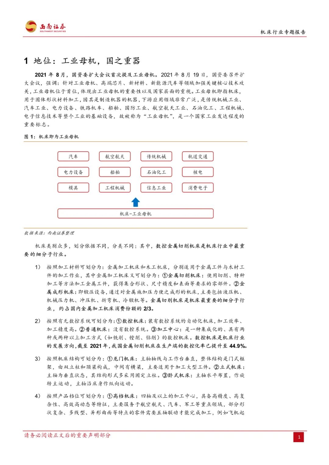 2021年 8月 19日,国资委召开扩大会议,首次提及工业母机,并强调针对工业母机、高端芯片、新材料、新能源汽车等领域加强关键核心技术攻关,工业母机位于首位,体现出工业母机的重要性以及国家层面的重视。机床是一切工业制造的基础设备,故被称为“工业母机”;其中,数控金属切削机床是机床行业最重要的分支。