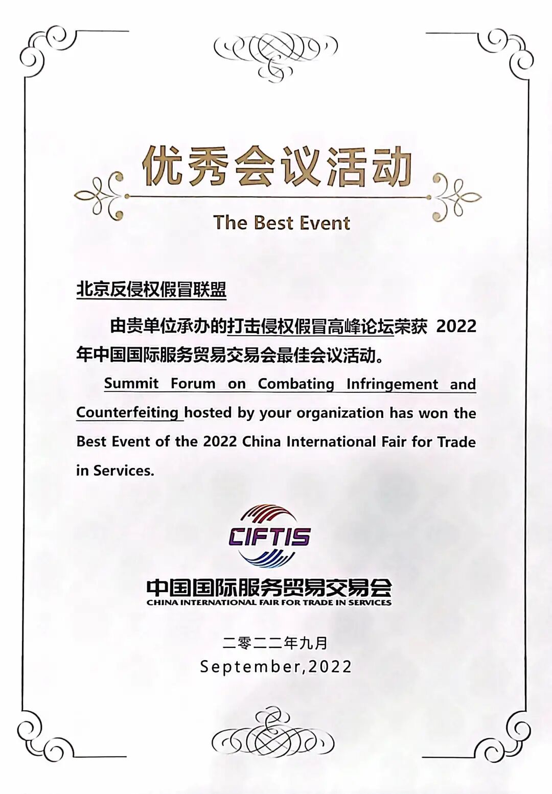 北京反侵权假冒联盟CAASA承办的“打击侵权假冒高峰论坛“荣获了“2022年中国国际服务贸易交易会最佳会议活动”的奖项。