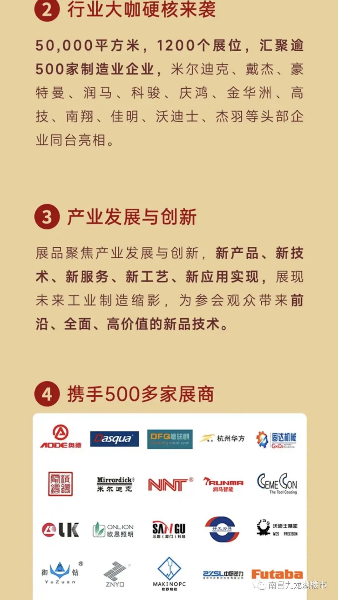 2022年中国中部工业博看会,展会展出面积共5万平方米,展位数2000余个,展商近500家。国际权威行业头部企业汇聚:润马、奥地利威猛、日本日钢、大通精密、三杰数控、瑞钧、精仁、行锐、泷泽、高松、THK、米尔迪克、意大利吉拉蒂、德国森捷、日本和信通商、法国鸿华、美国巴塞特、韩国特固克、精雕、创世纪、大族激光、中国电信、中国移动、中国联通、江铃汽车、富强鑫、塞维斯、商鼎、戴杰、江西微驰、凤凰光学、江西赛弗特、香港衣车协会、江西省无人机应用协会等覆盖机床、机器人、自动化、数控刀具、精密注塑、压铸、机床附件、模具制造、3D打印、纺织制衣、五金、工业互联、VR、无人机等产业,展现未来工业制造缩影。