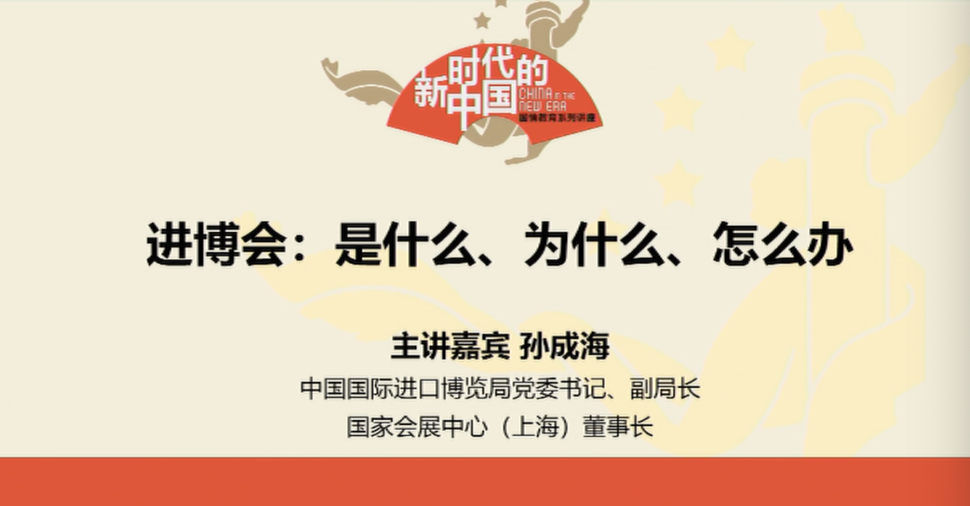 孙成海就进博会全称“中国国际进口博览会”中的四个关键词展开了论述,提出进博会是拥有国家级平台、较高国际化程度、以进口为主题的具有大规模的展会,并引用习近平主席在第五届进博会开幕式上的致辞“进博会已经成为中国构建新发展格局的窗口、推动高水平开放的平台、全球共享的国际公共产品”,对进博会的含义进行了进一步介绍。
