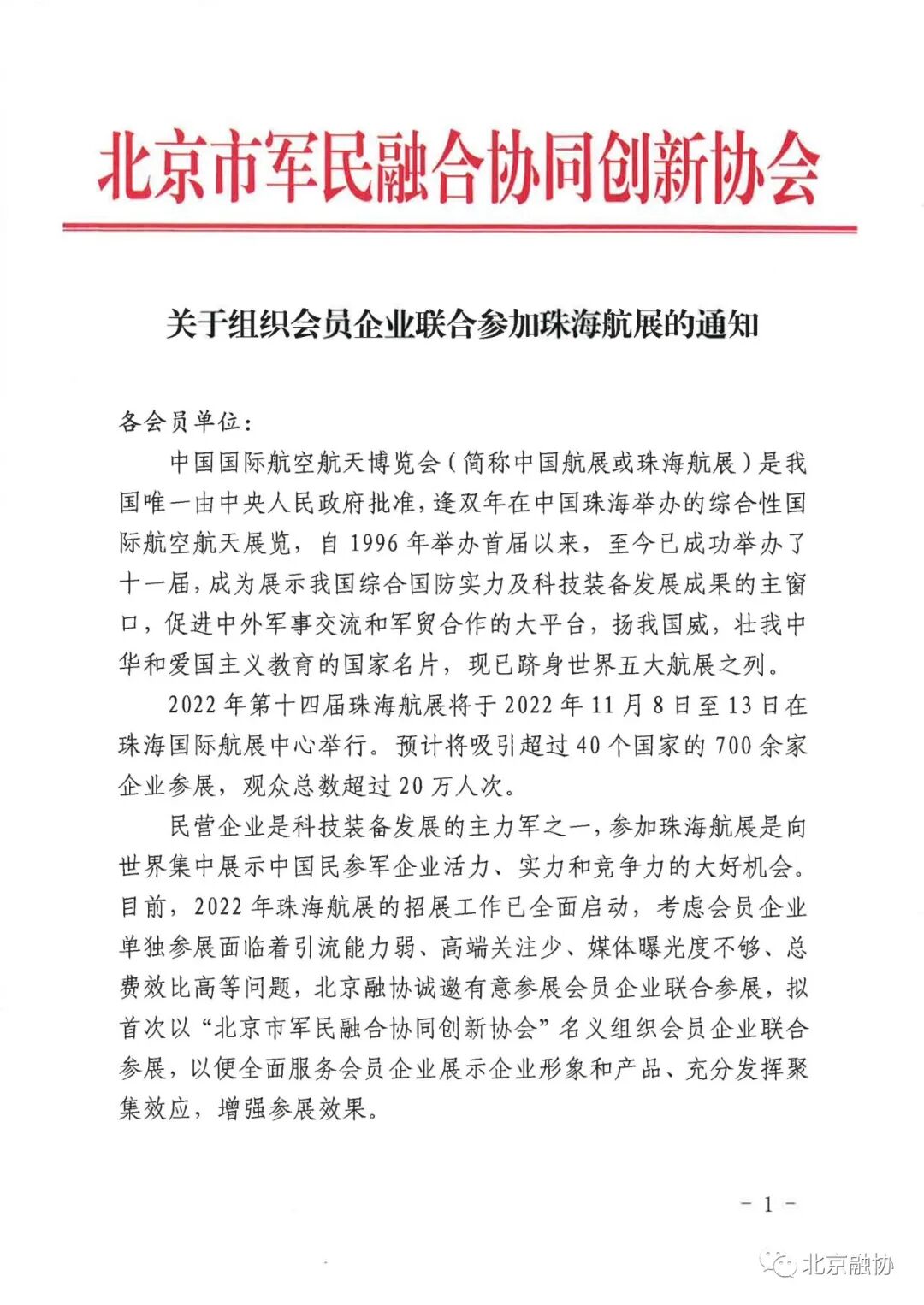 民营企业是科技装备发展的主力军之一,参加珠海航展是向世界集中展示中国民参军企业活力、实力和竞争力的大好机会。目前,2022年珠海航展的招展工作已全面启动,考虑会员企业单独参展面临着引流能力弱、高端关注少、媒体曝光度不够、总费效比高等问题,北京融协诚邀有意参展会员企业联合参展,拟首次以“北京市军民融合协同创新协会”名义组织会员企业联合参展,以便全面服务会员企业展示企业形象和产品、充分发挥聚集效应,增强参展效果。