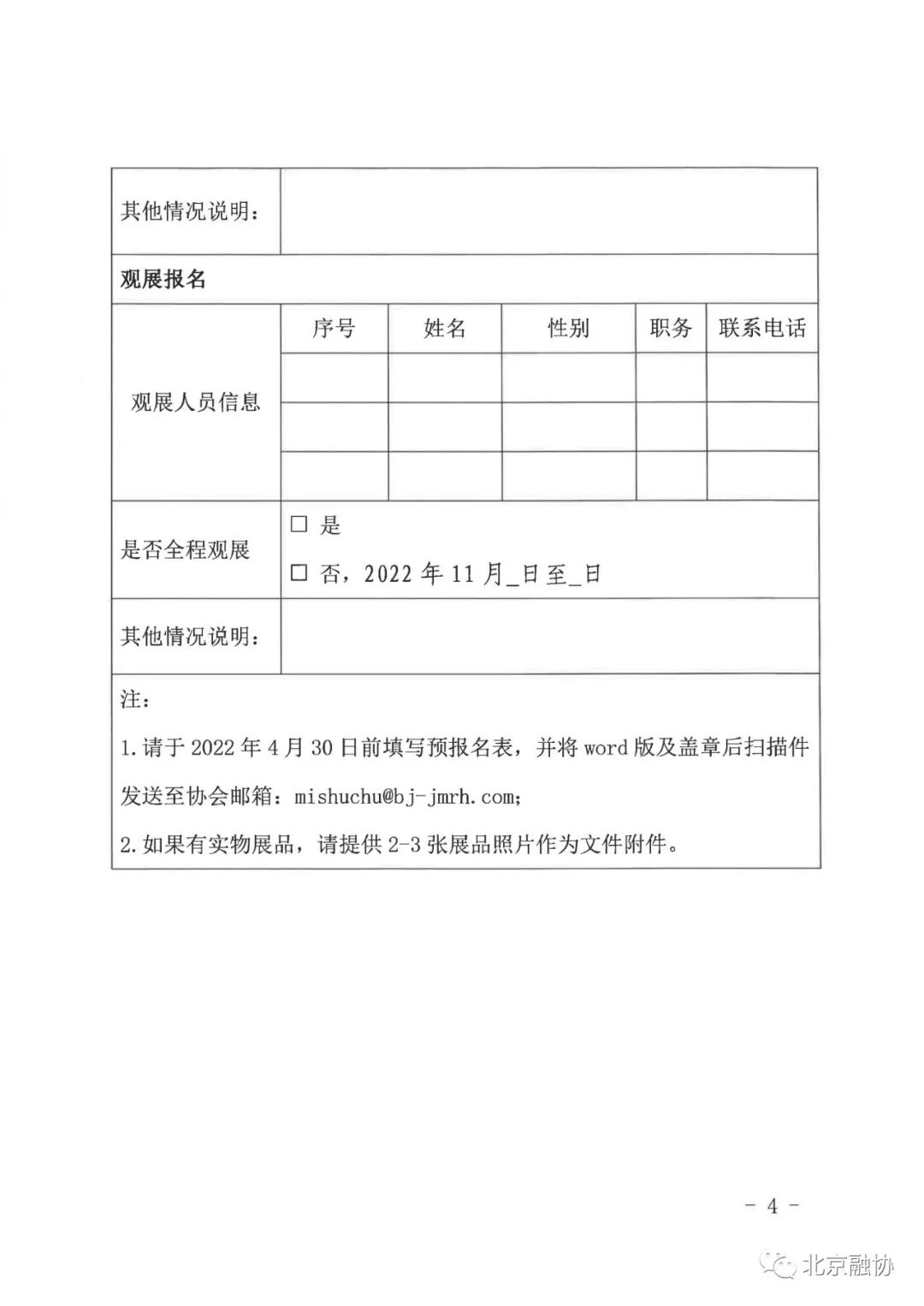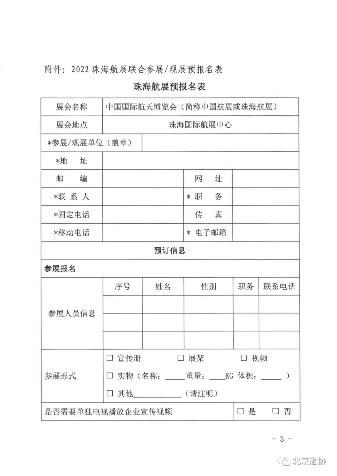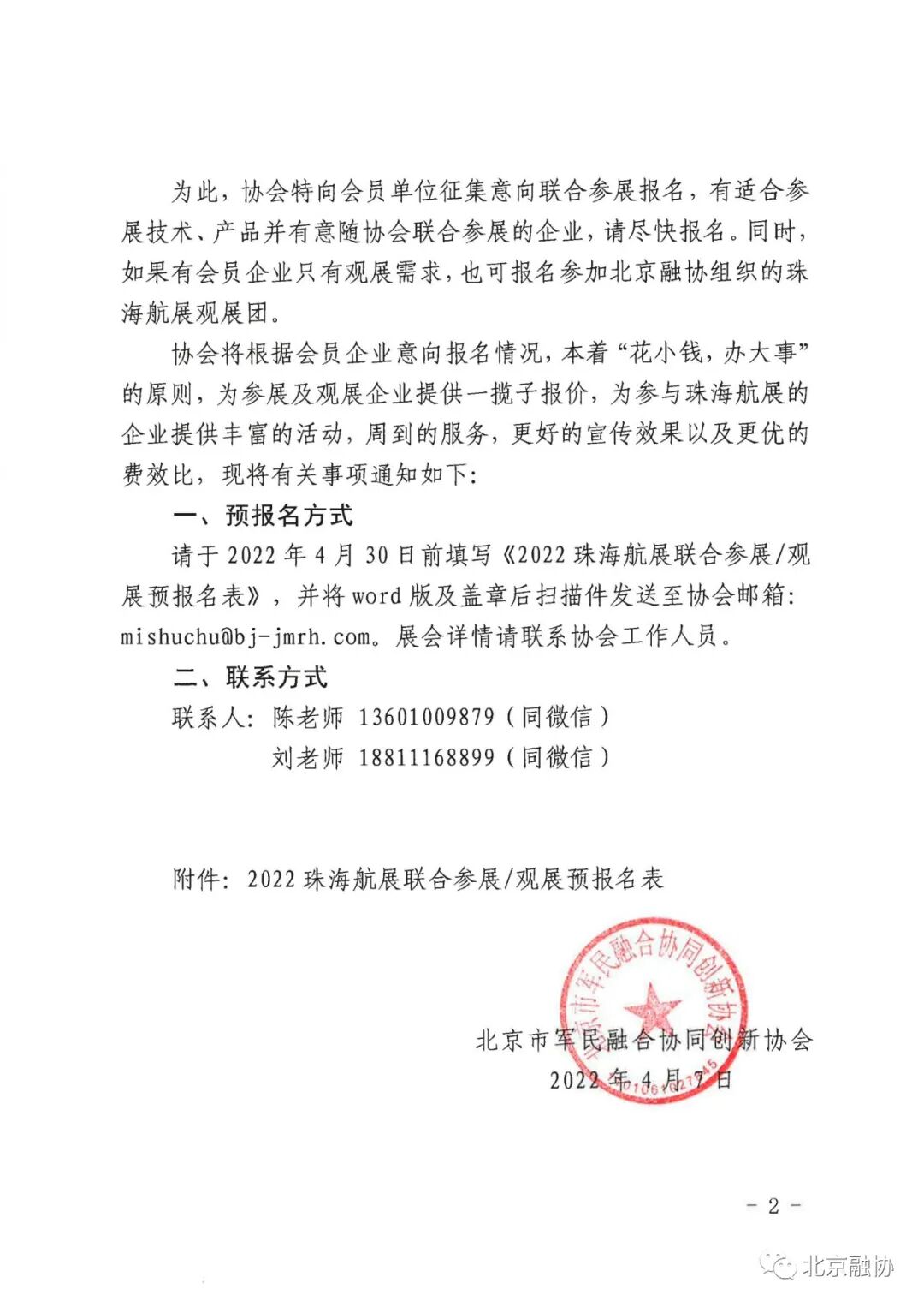 请于2022年4月30日前填写《2022珠海航展联合参展/观展预报名表》,并将word版及盖章后扫描件发送至协会邮箱:mishuchu@bj-jmrh.com。展会详情请联系协会工作人员。