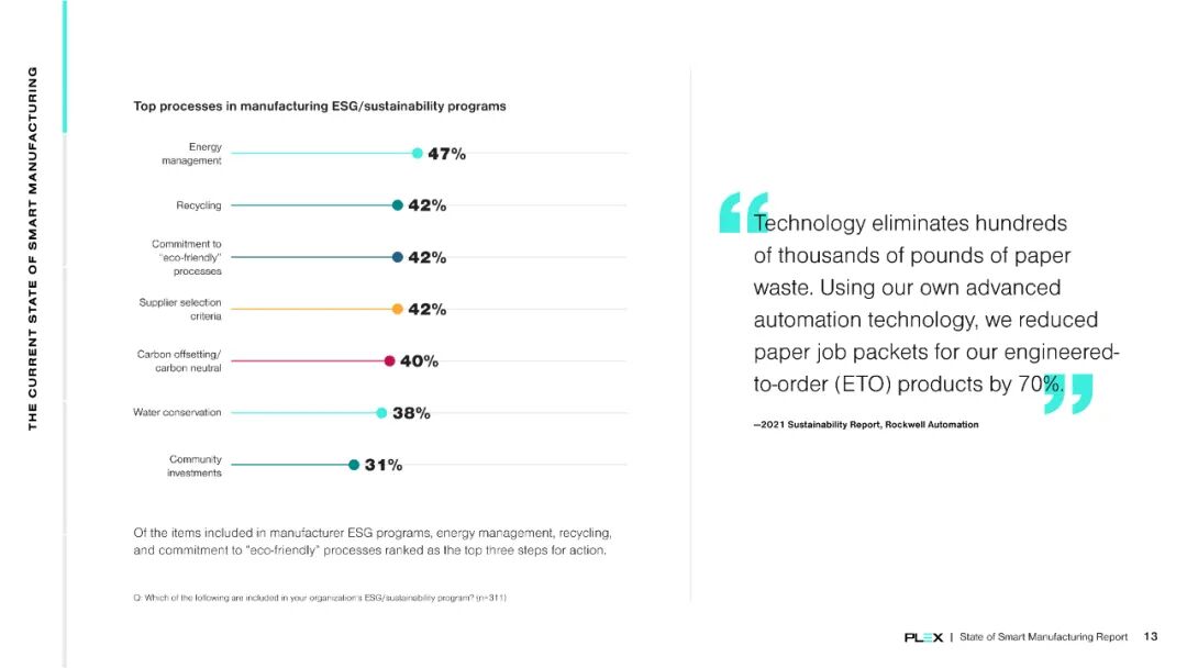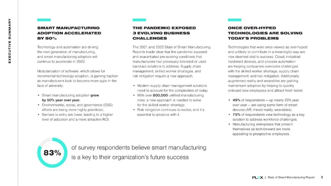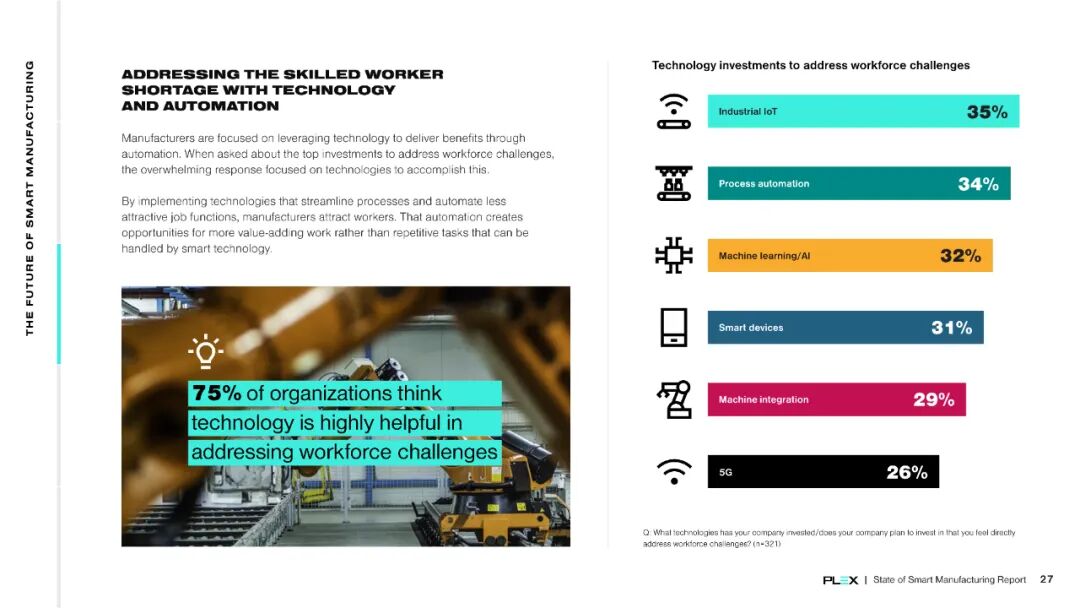 近日,罗克韦尔自动化公司旗下云交付智能制造解决方案供应商普莱克斯系统公司(Plex Systems)发布第7份年度《智能制造现状报告》。《报告》显示,2021年,全球智能制造应用加快了50%,这些新技术在行业面临的关键挑战中起着重要作用。