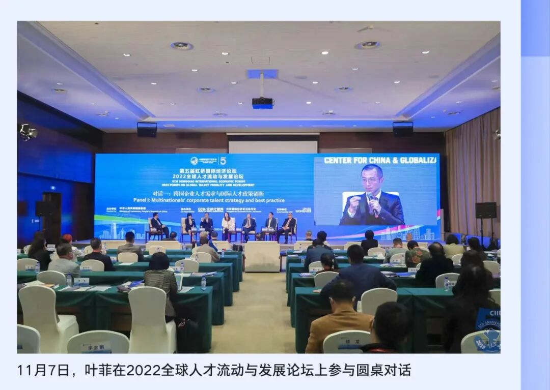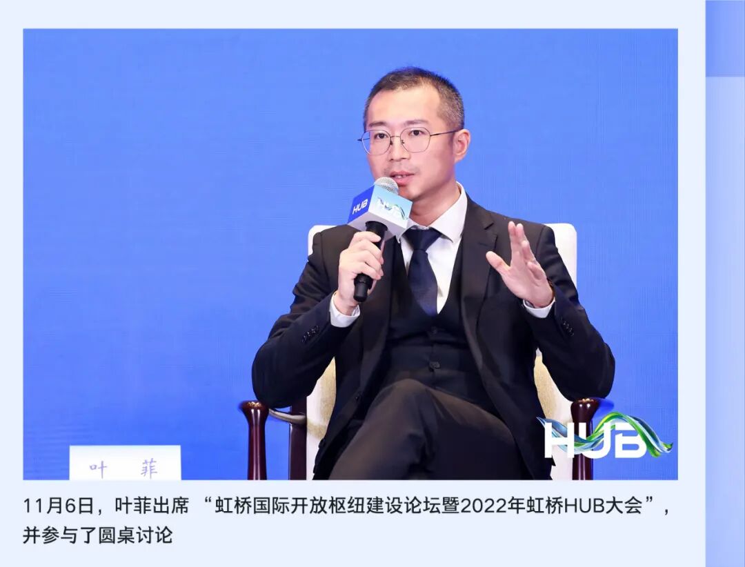 11月6日,叶菲先生出席 “虹桥国际开放枢纽建设论坛暨2022年虹桥HUB大会”,并参与了圆桌讨论,与各市场主体代表,共话深化开放背景下的虹桥国际枢纽建设,聚焦人才、信息、贸易、资本流动等核心功能,共同描摹虹桥国际中央商务区面向全球、面向未来的发展愿景。