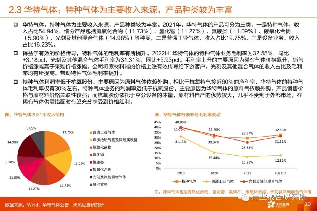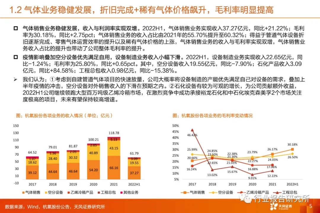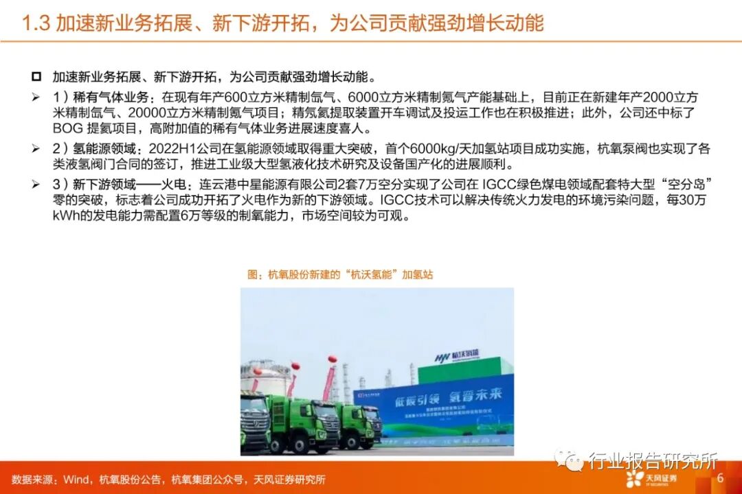 气体销售业务稳健发展,收入与利润率实现双增。2022H1,气体销售业务实现收入37.27亿元,同比+21.22%;毛利率为30.18%,同比+2.75pct;气体销售业务的收入占比由2021年的55.70%提升至60.32%;得益于管道气体设备折旧逐渐完成、零售气体运营效率的提升以及稀有气体价格的上涨,气体销售业务的收入与毛利率实现双增,气体销售业务收入占比的提升也带动了公司整体毛利率的提升。➢加速新业务拓展、新下游开拓,为公司贡献强劲增长动能。稀有气体业务:在现有年产600立方米精制氙气、6000立方米精制氪气产能基础上,目前正在新建年产2000立方米精制氙气、20000立方米精制氪气项目;精氖氦提取装置开车调试及投运工作也在积极推进;中标BOG提氦项目,高附加值的稀有气体业务进展速度喜人。此外,氢能源领域,首个6000kg/天加氢站项目成功实施,杭氧泵阀也实现了各类液氢阀门合同的签订;新下游领域——火电,连云港中星能源有限公司2套7万空分实现了公司在IGCC绿色煤电领域配套特大型“空分岛”零的突破。