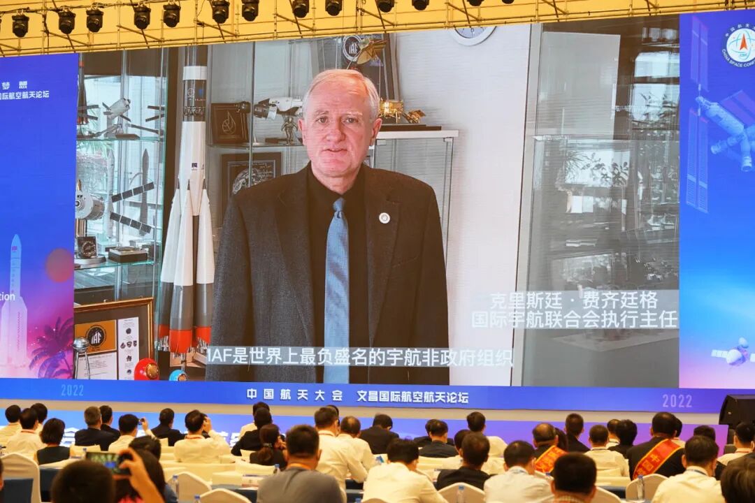 大会开幕式上,国际宇航联合会执行主任克里斯汀·费奇廷格通过视频致辞。