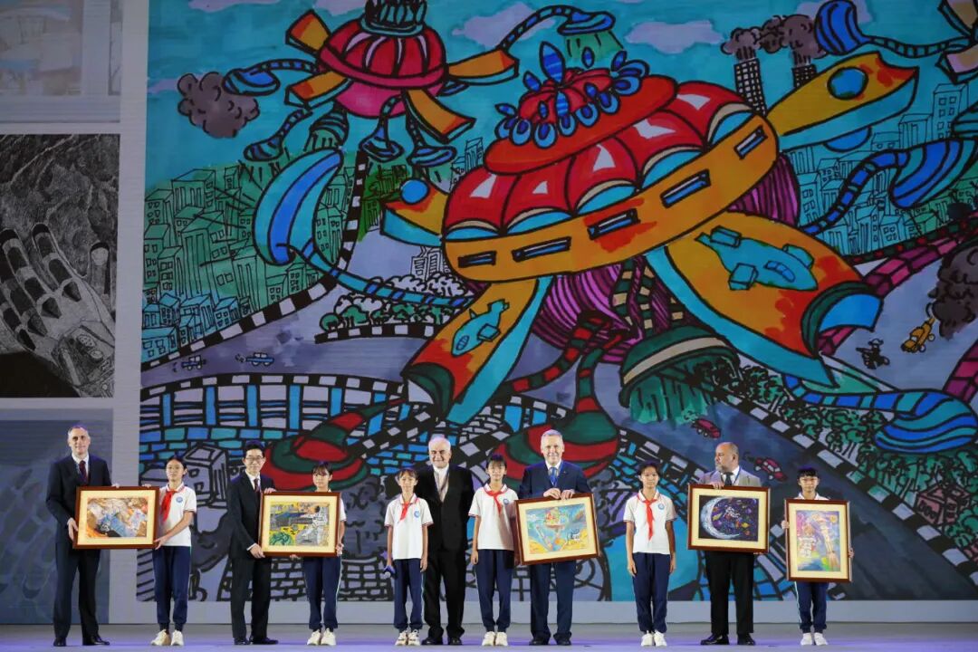 大会开幕式上举行了“我的太空梦”航天主题绘画赠礼。来自海南省文昌市龙楼镇航天小学的小朋友们展示了精心创作的绘画作品,分享了背后的创作故事,并向外宾赠送作品。