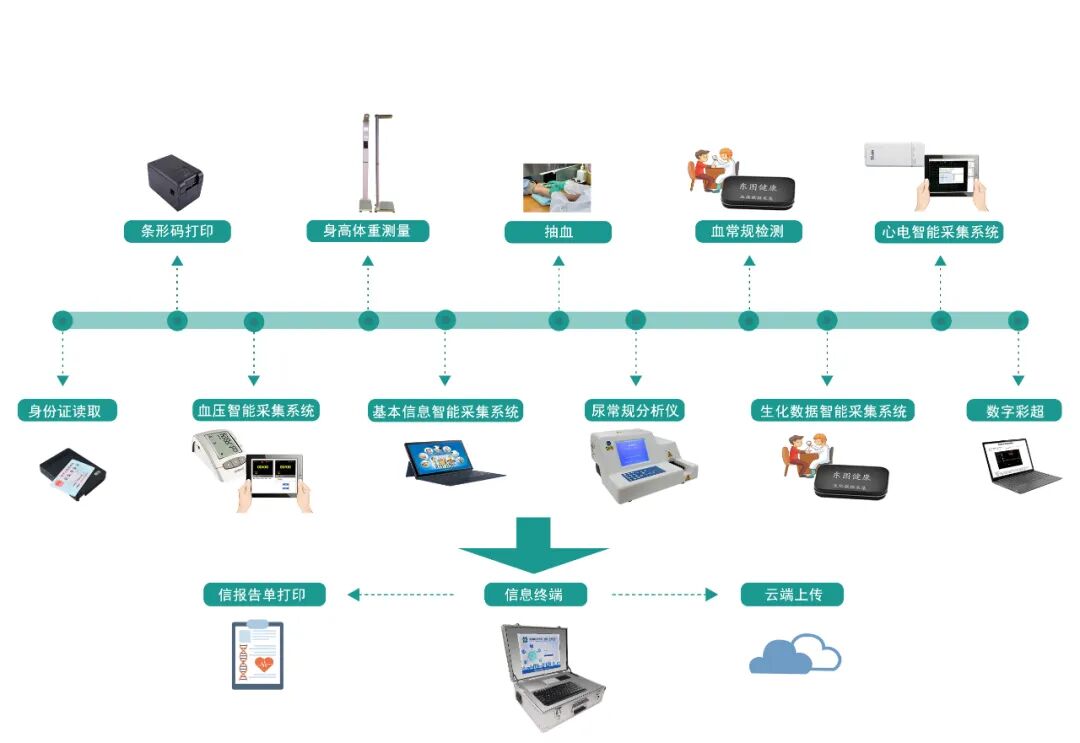 便携式公共卫生智能查体采集设备,易于携带,可实现现场检验、自动出结果,对数据异常项、漏项自动筛查,自动统计分析,可自动打印档案,互联互通数据自动整合,并一键上传至公共卫生管理平台。