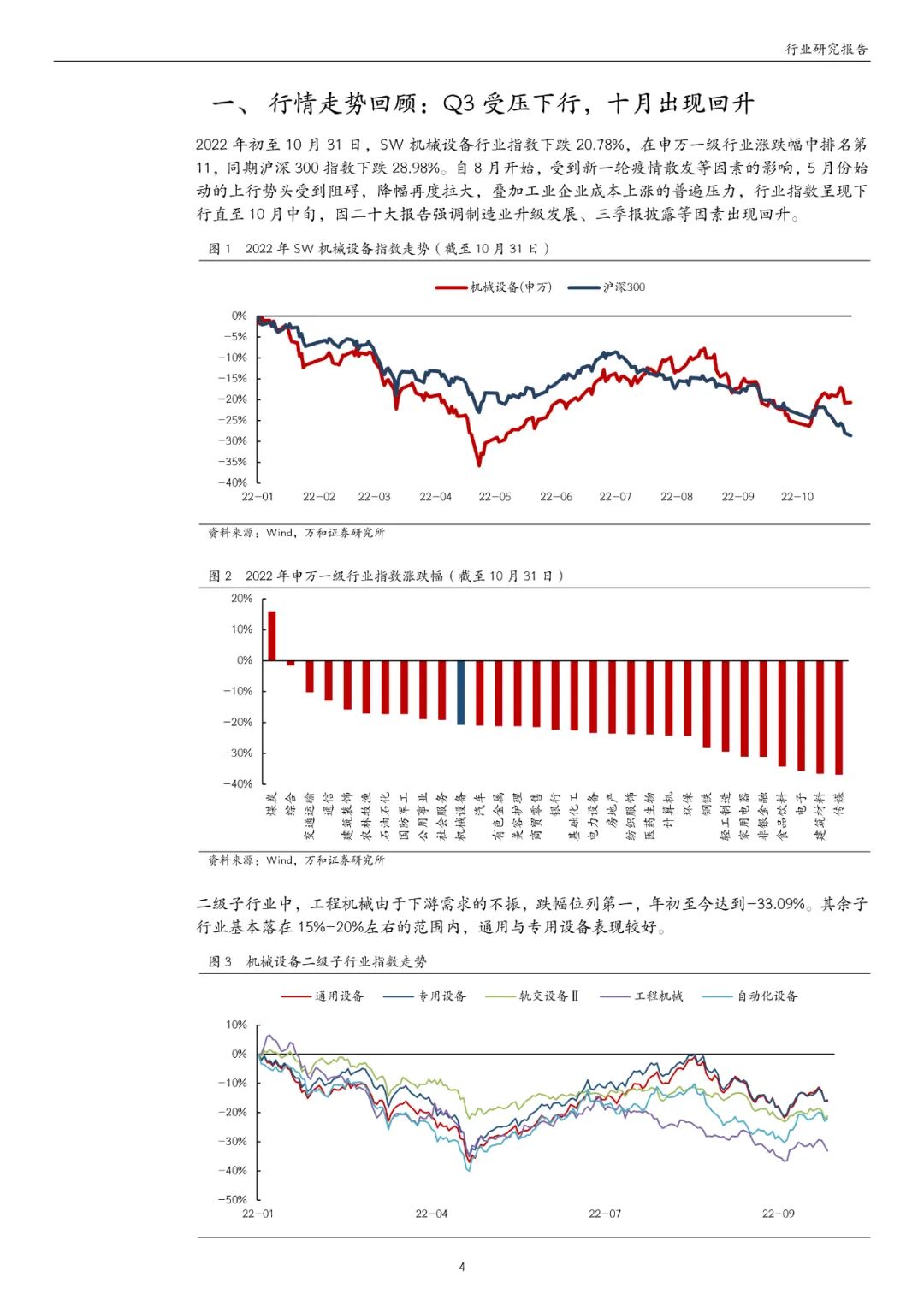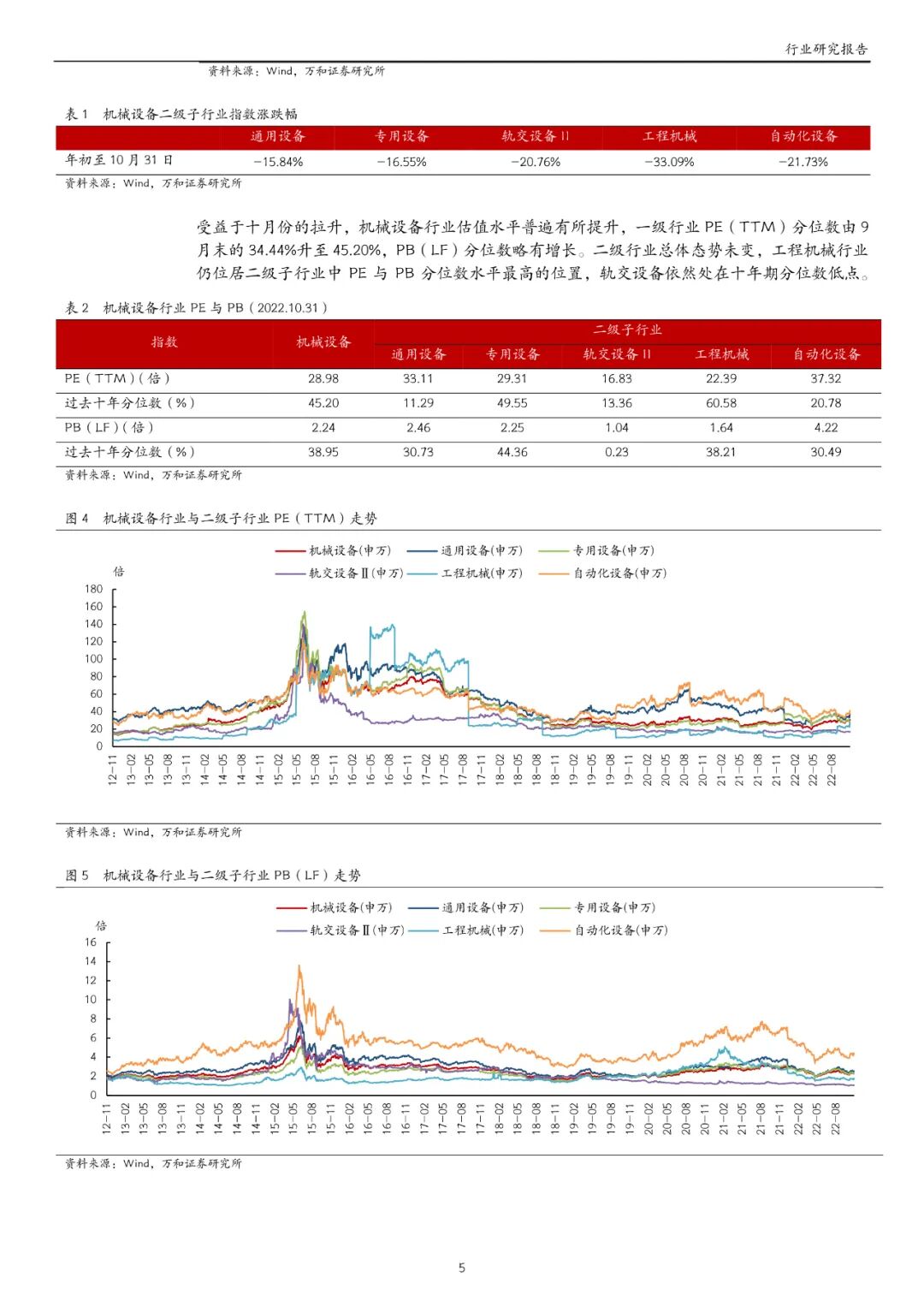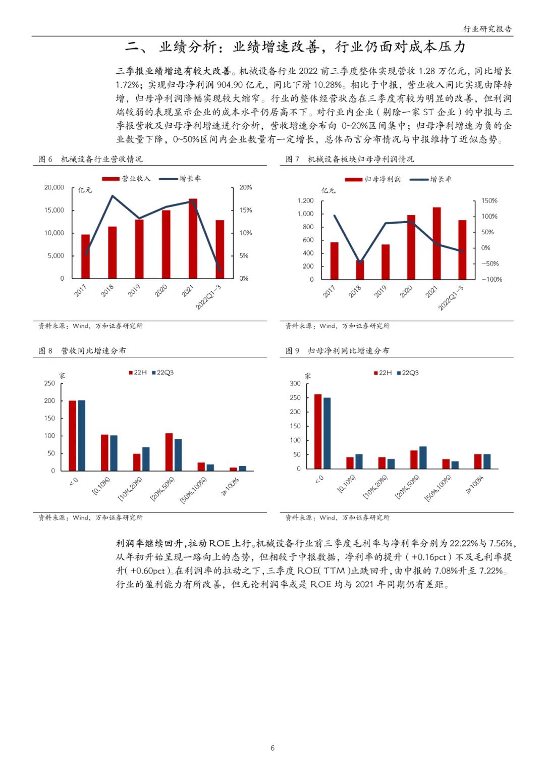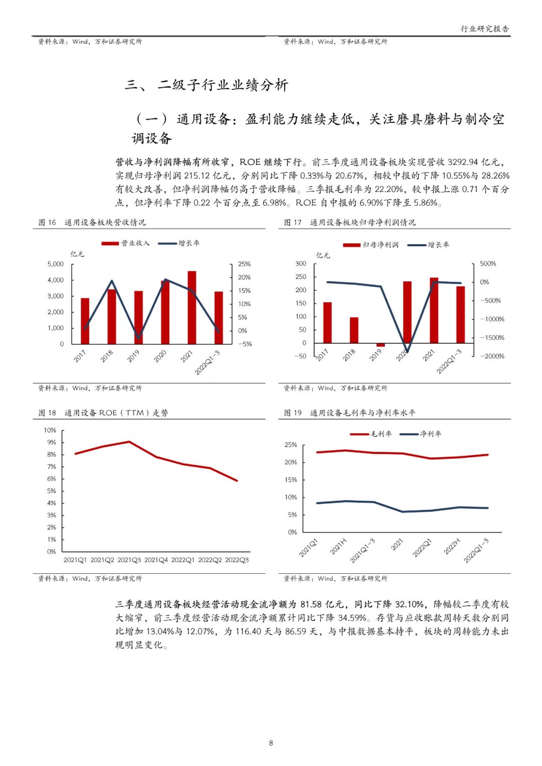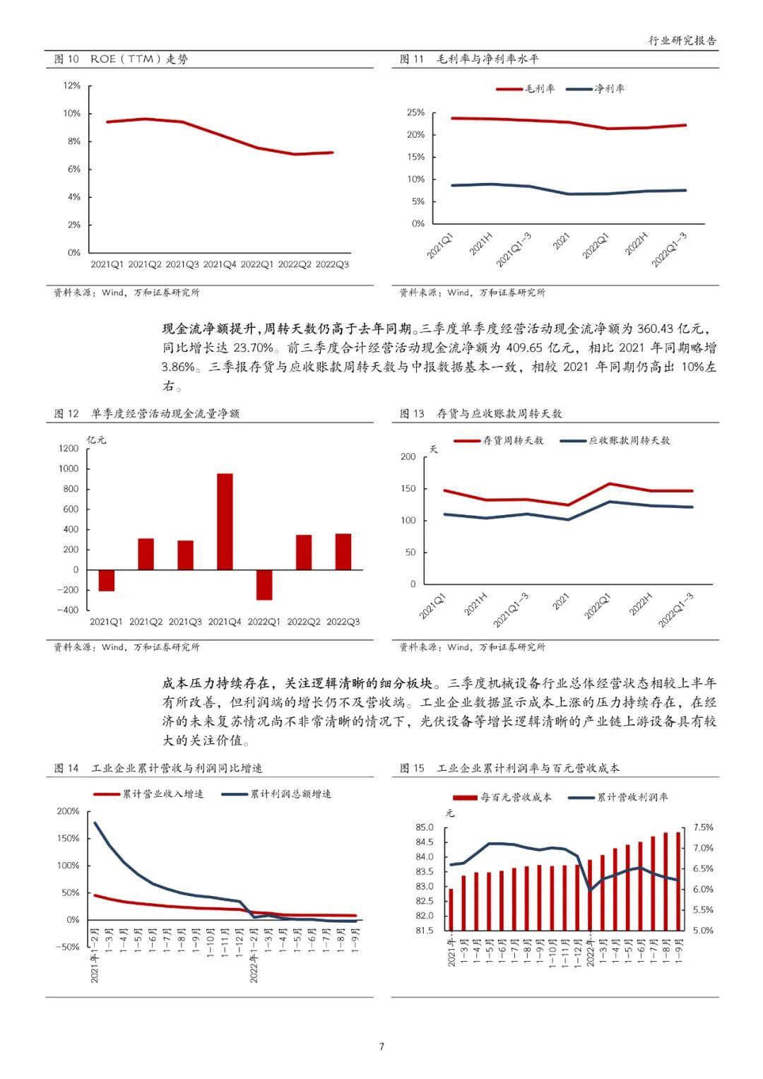 机械设备行业前三季度营收 1.28万亿元,同比增长 1.72%;归母净利润 904.90 亿元,同比下滑 10.28%。相比于中报,营业收入同比实现由降转增,归母净利润同比降幅实现较大缩窄。前三季度毛利率与净利率分别为 22.22%与 7.56%,但相较于中报,净利率提升(+0.16pct)不及毛利率提升(+0.60pct)。三季度 ROE(TTM)止跌回升,由中报的 7.08%升至 7.22%,但利润率与 ROE 均与 2021 年同期有差距。三季度经营活动现金流净额为 360.43 亿元,同比增长 23.70%,前三季度合计增长 3.86%。三季报存货与应收账款周转天数与中报基本一致,较 2021 年同期高 10%左右。