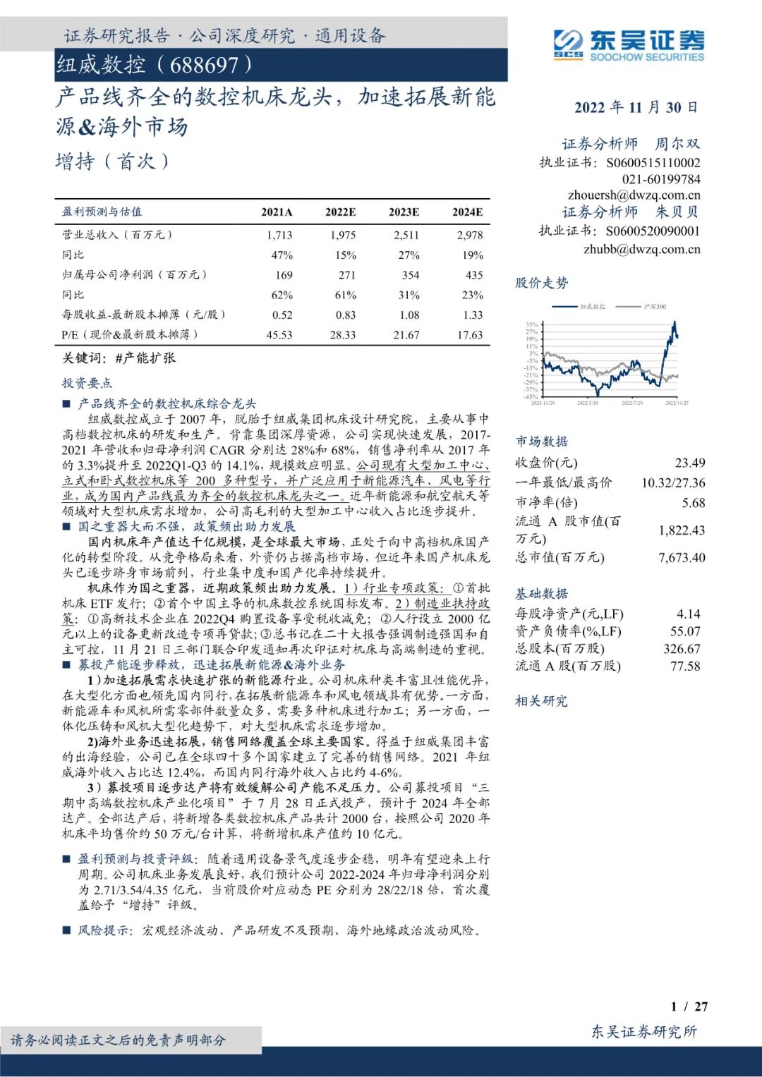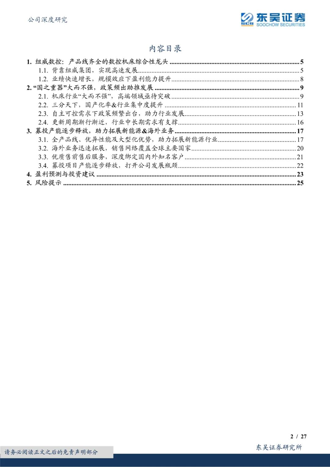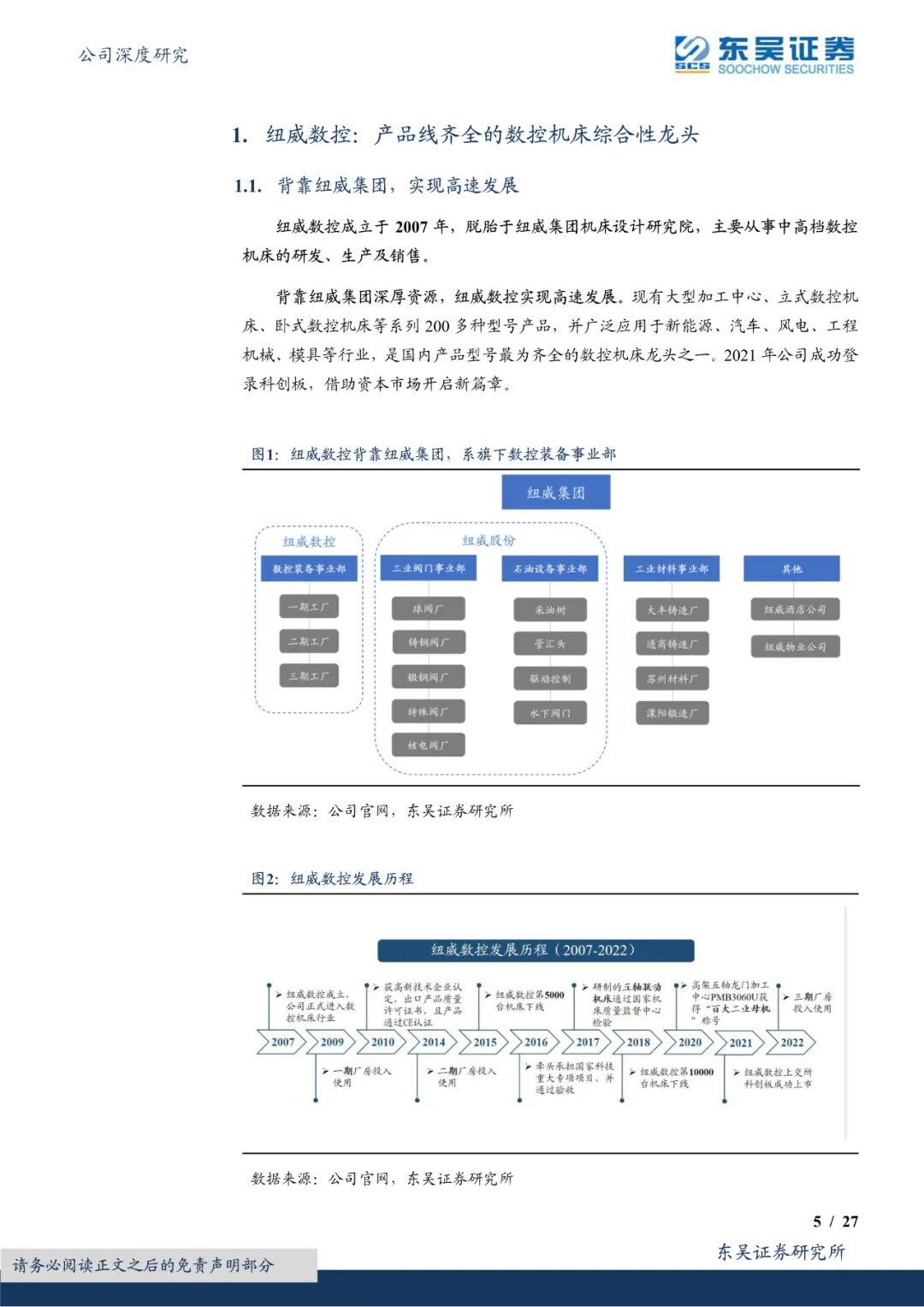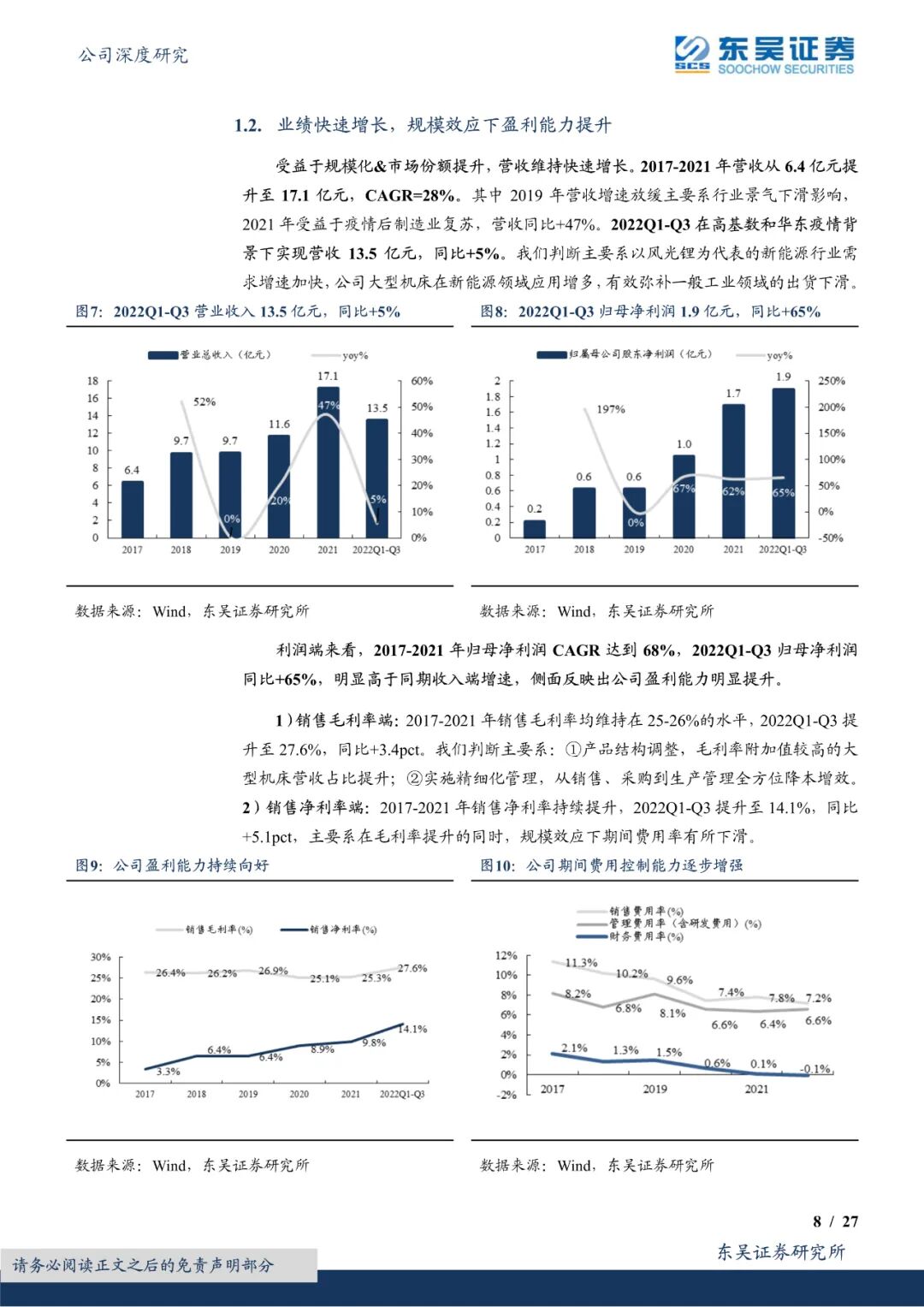 纽威数控成立于 2007 年,脱胎于纽威集团机床设计研究院,主要从事中高档数控机床的研发和生产。背靠集团深厚资源,公司实现快速发展,2017-2021 年营收和归母净利润 CAGR 分别达 28%和 68%,销售净利率从 2017 年的 3.3%提升至 2022Q1-Q3 的 14.1%,规模效应明显。公司现有大型加工中心、立式和卧式数控机床等 200 多种型号,并广泛应用于新能源汽车、风电等行业,成为国内产品线最为齐全的数控机床龙头之一。近年新能源和航空航天等领域对大型机床需求增加,公司高毛利的大型加工中心收入占比逐步提升。