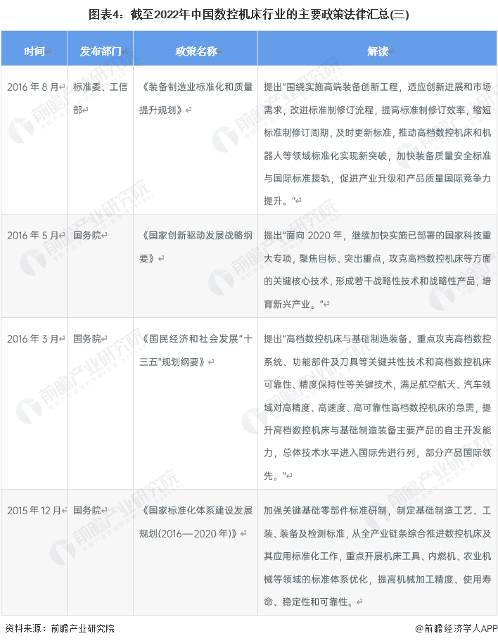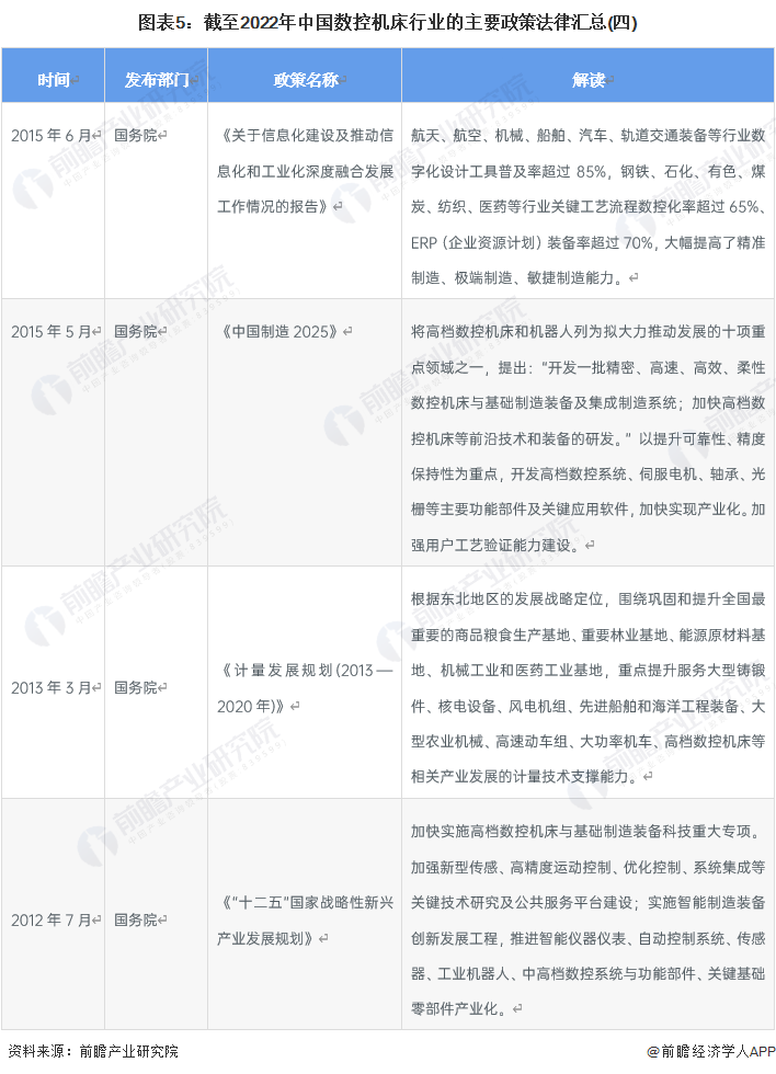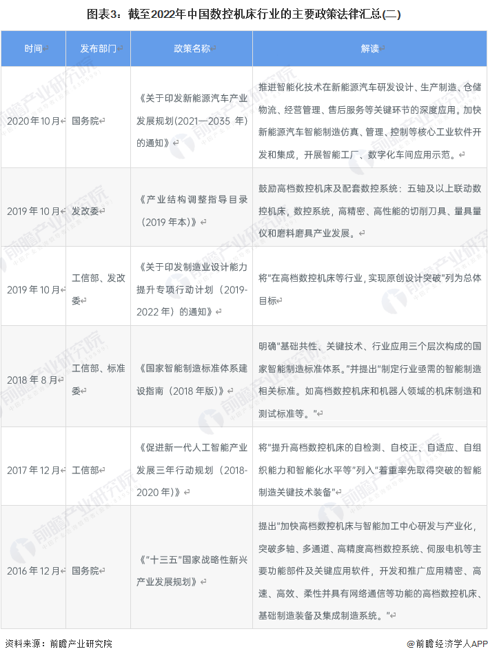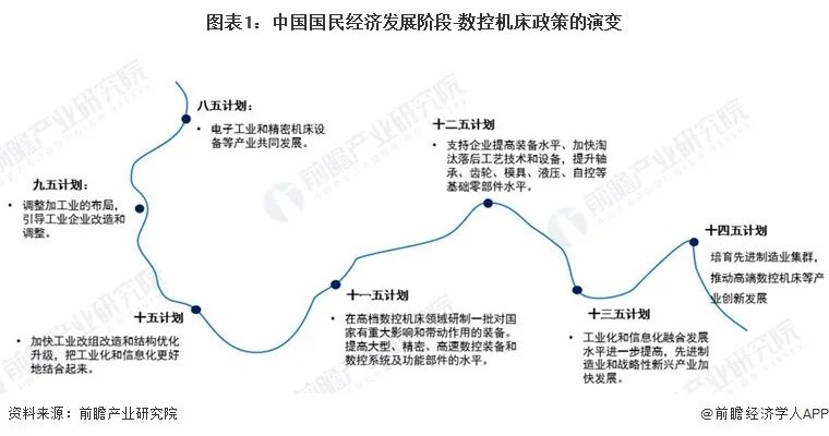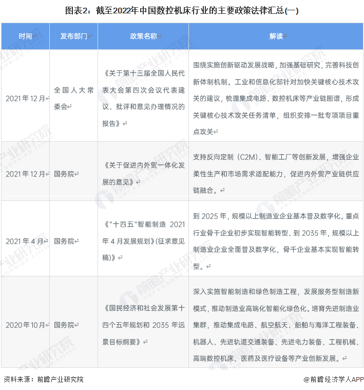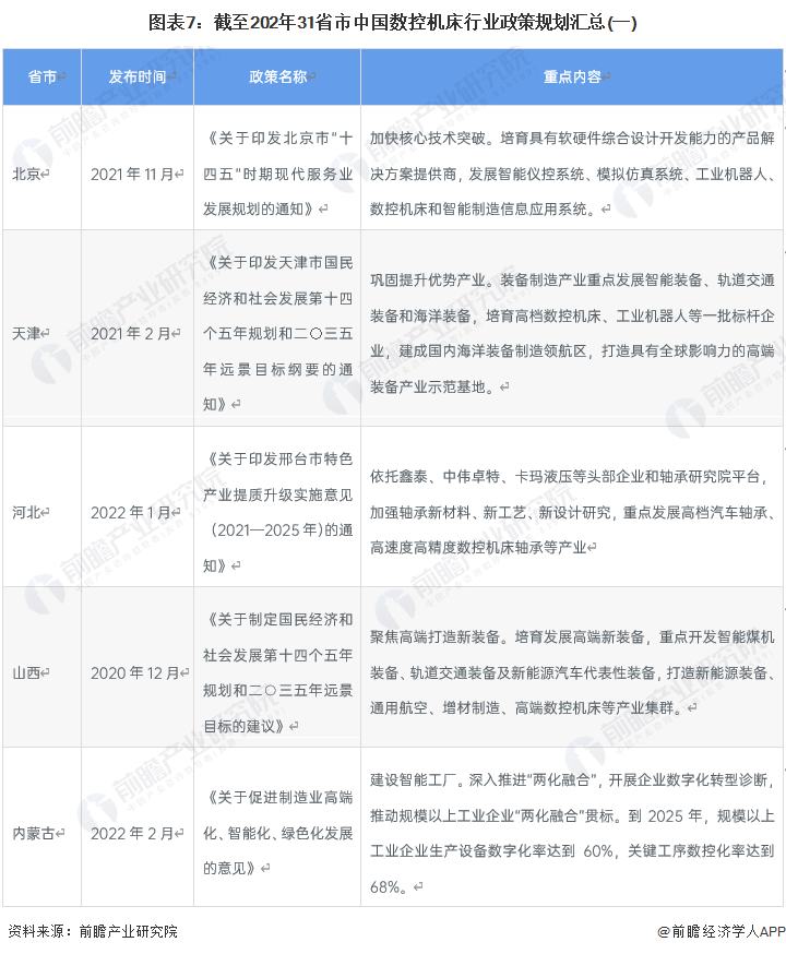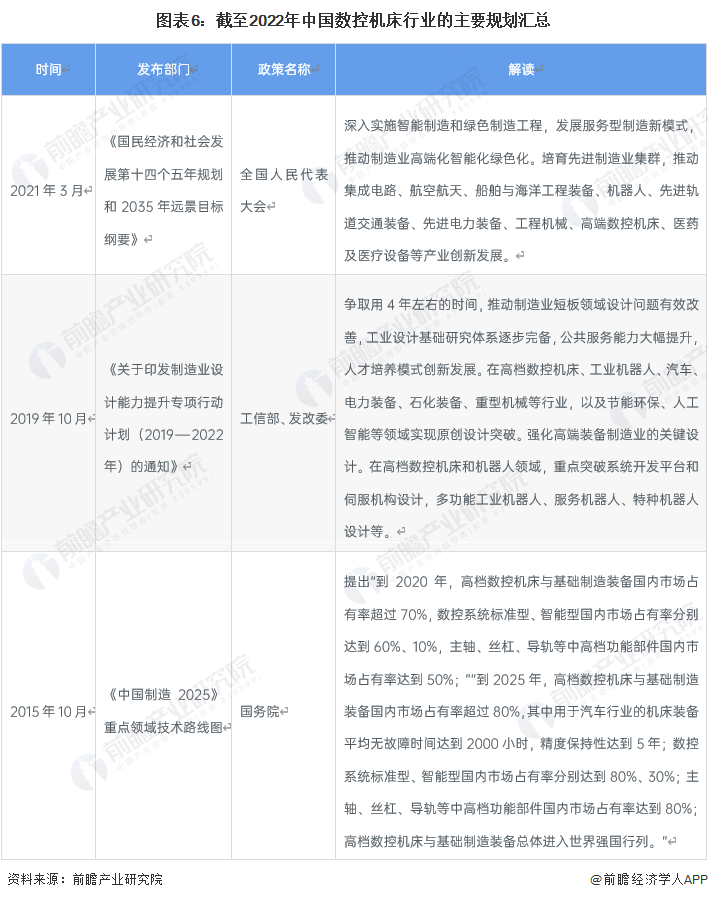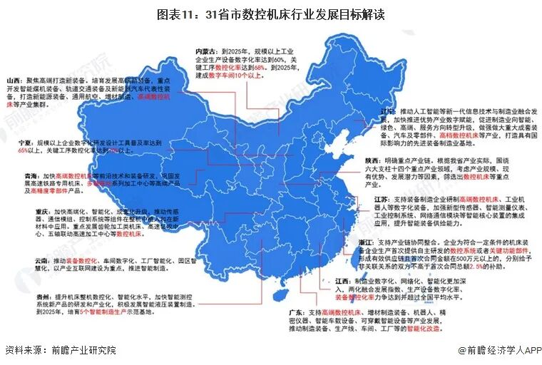 要求企业提高装备水平、淘汰落后工艺和设备,力争让工业化和信息化融合发展水平进一步提高;“十四五”时期,国家重点培育先进制造业集群,推动高端数控机床等产业创新发展。近年来,国家有关部门出台多项数控机床行业相关发展支持政策,行业主要政策包括《中国制造2025》、《国民经济和社会发展“十三五”规划纲要》、《国民经济和社会发展第十四个五年规划和2035年远景目标纲要》等。《中国制造2025》重点领域技术路线图指出,到2025年,高档数控机床与基础制造装备国内市场占有率超过80%,其中用于汽车行业的机床装备平均无故障时间达到2000小时,精度保持性达到5年;数控系统标准型、智能型国内市场占有率分别达到80%、30%;主轴、丝杠、导轨等中高档功能部件国内市场占有率达到80%;高档数控机床与基础制造装备总体进入世界强国行列。“十四五规划”重点提到,要推动制造业优化升级,推动高档数控机床等新兴产业的发展,就此各省市根据自身情况,进行相关先进制造体系和数控机床产业部署。十四五期间,陕西、内蒙古、辽宁、江苏、浙江、江西、广东、贵州、云南、四川、重庆、宁夏等多个省市,针对当地情况提出了相应的数控机床产业发展目标。其中宁夏自治区指出,到2025年规模以上企业数字化研发设计工具普及率达到65%以上,关键工序数控化率达到70%以上;内蒙古自治区指出,到2025年规模以上工业企业生产设备数字化率达到60%,关键工序数控化率达到60%以上。更多本行业研究分析详见前瞻产业研究院《中国数控机床行业市场需求与投资战略规划分析报告》,同时前瞻产业研究院还提供产业大数据、产业研究、政策研究、产业链咨询、产业图谱、产业规划、园区规划、产业招商引资、IPO募投可研、IPO业务与技术撰写、IPO工作底稿咨询等解决方案。