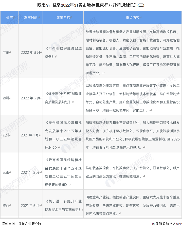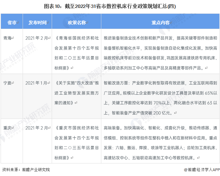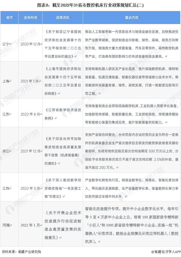 自“八五计划”以来,国务院、国家发改委等多部门都陆续印发了支持、规范数控机床行业的发展政策,内容涉及高端数控机床、数控系统、功能配件、数控机床产业发展方向等内容。“十四五”期间,我国主要省份也各自提出了数控机床行业的发展目标。