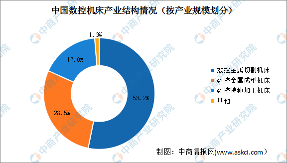 我国数控金属切割机床产业规模最大,占比53.2%,数控金属成型机床紧随其后,产业规模占比28.5%,数控特种加工机床产业规模占比较小,仅17.0%。