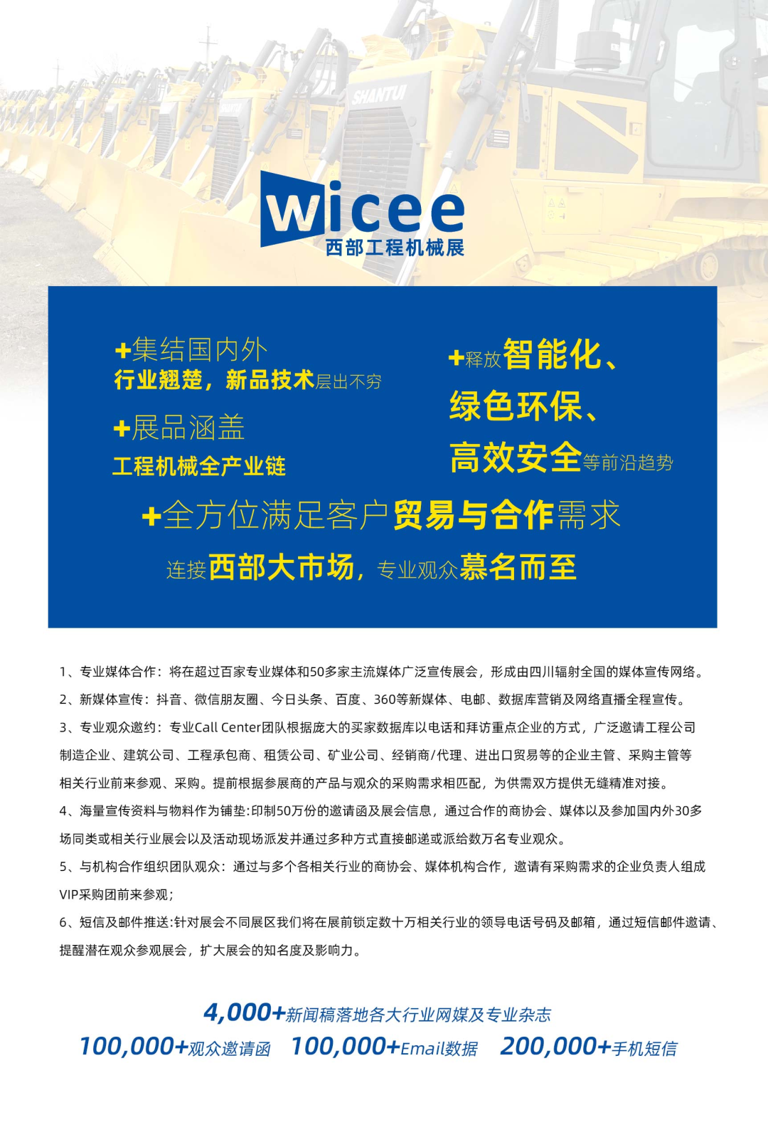 2022中国西部(成都)国际工程机械展览会将于2023年7月6-8日在成都隆重召开!本届展会由上海泛国展览有限公司联合行业权威机构共同组织。涵盖工程机械、施工机械、建筑机械、矿山机械、商用车辆、应急救援设备等工程机械领域全链条,成都工程机械展将以专业的组织机构和以客户需求为导向的办展理念;助力企业更好更快的拓展西部市场。为更多厂家和买家提供市场前沿动向,助推优质资源的精准对接。助力企业领先竞争对手拓展更多优质合作伙伴,挖掘新的业务方向与商机!同时致力于为行业人士提供一个以品牌宣传、商贸洽谈、产品交易为主的大型交流平台。