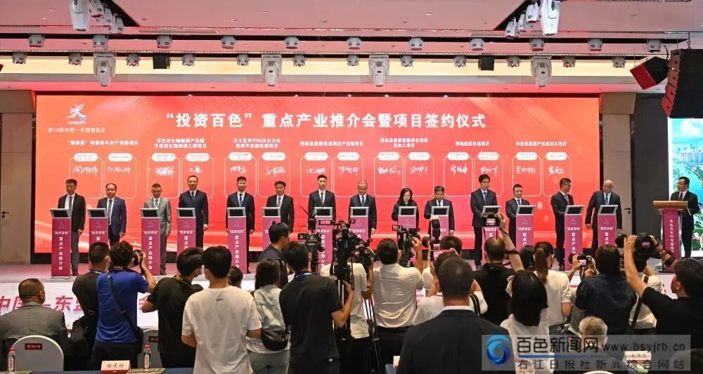 9月16日,百色市举行“投资百色”重点产业推介会暨项目签约仪式,向前来参加第19届中国—东盟博览会的区内外客商宣传推介百色,洽谈项目合作,现场共签约项目42个,总投资326.3亿元。项目涵盖铝精深加工、林业和高端绿色家居、高端金属新材料、绿色环保、大健康和文旅、现代农业等产业。