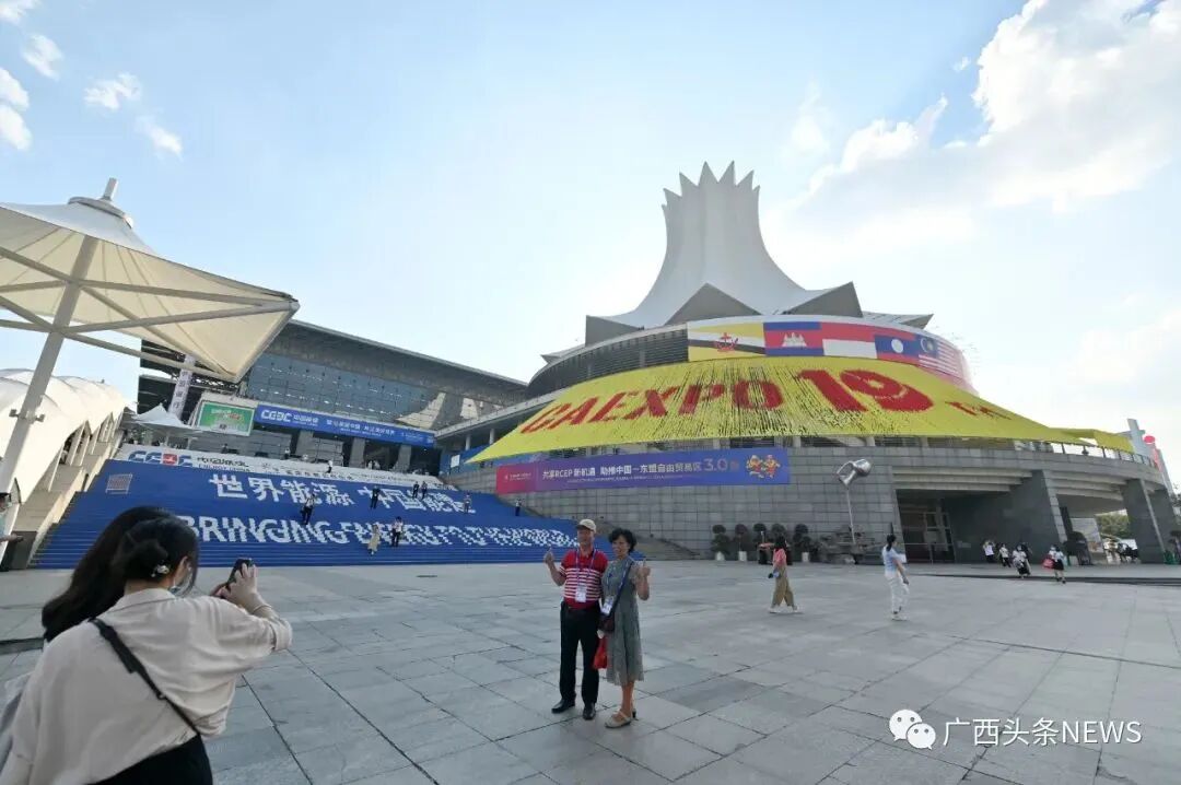 △客商在第19届中国—东盟博览会展馆外合影。俞靖 摄