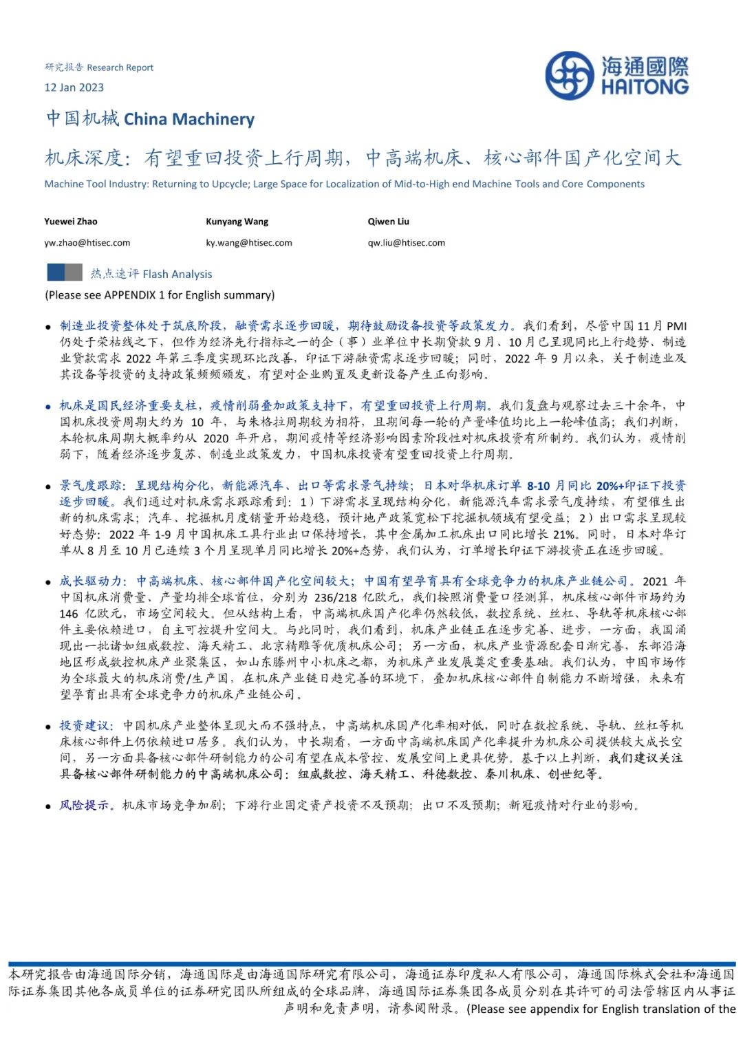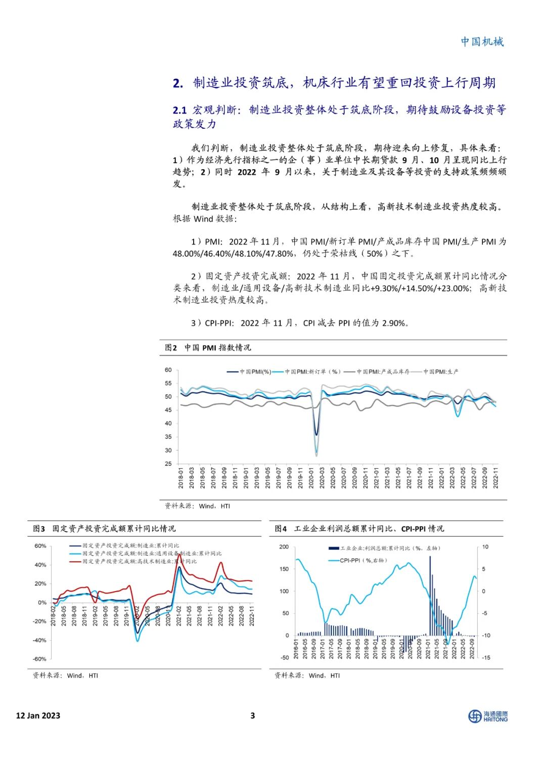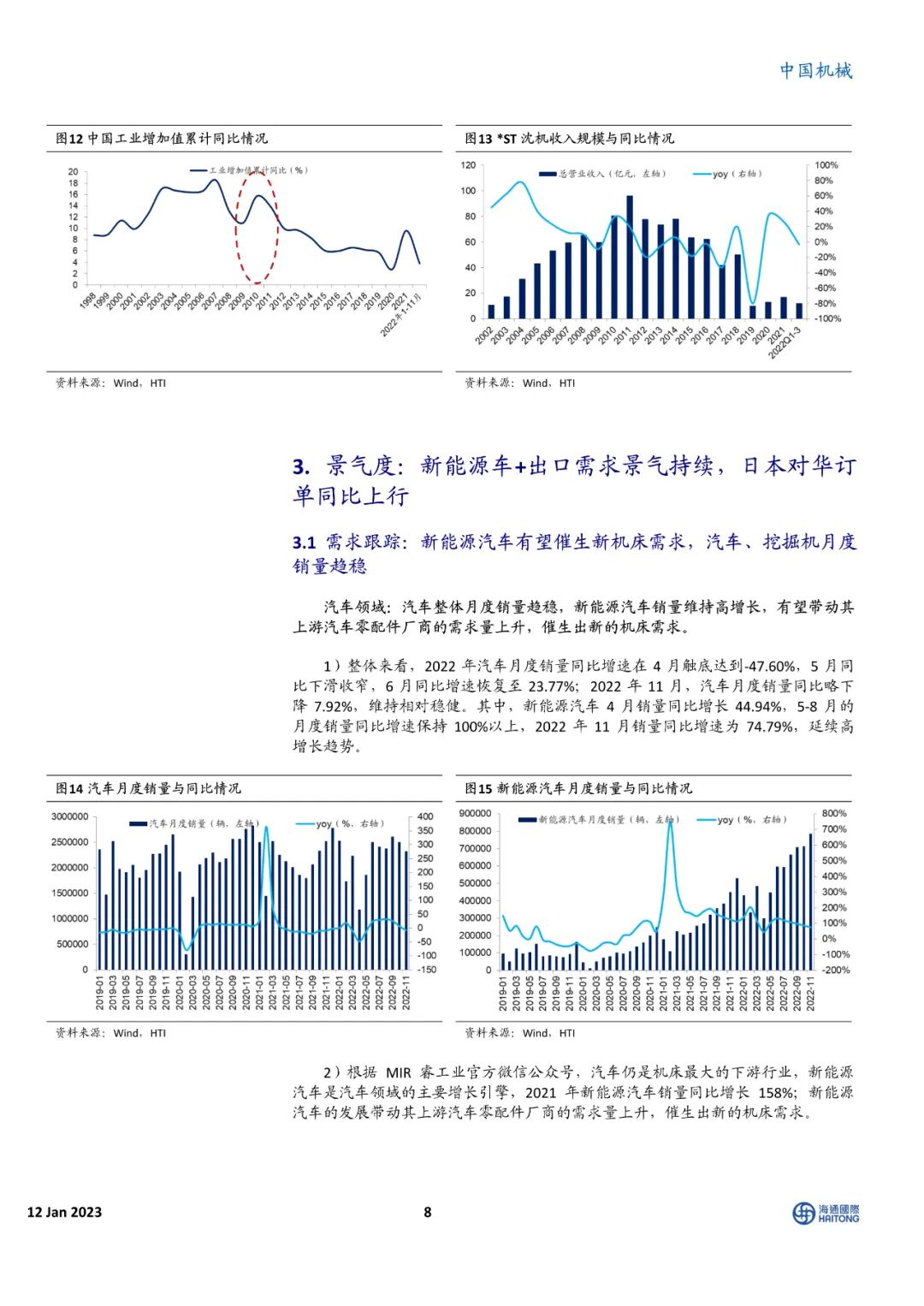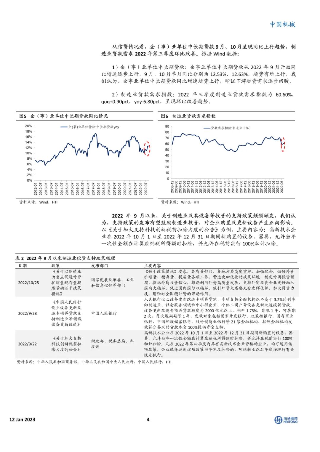 我们看到,尽管中国 11 月 PMI仍处于荣枯线之下,但作为经济先行指标之一的企(事)业单位中长期贷款 9 月、10 月已呈现同比上行趋势、制造业贷款需求 2022 年第三季度实现环比改善,印证下游融资需求逐步回暖;同时,2022 年 9 月以来,关于制造业及其设备等投资的支持政策频频颁发,有望对企业购置及更新设备产生正向影响。