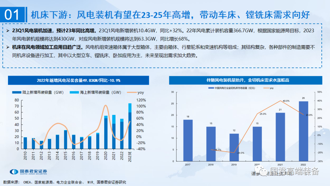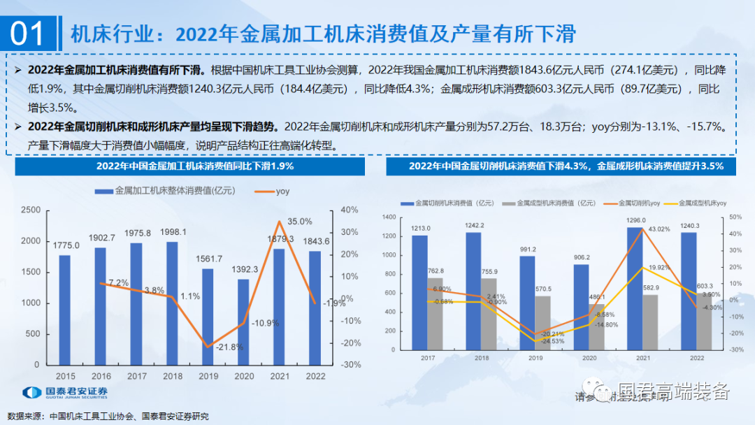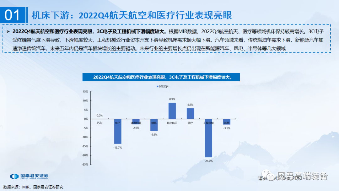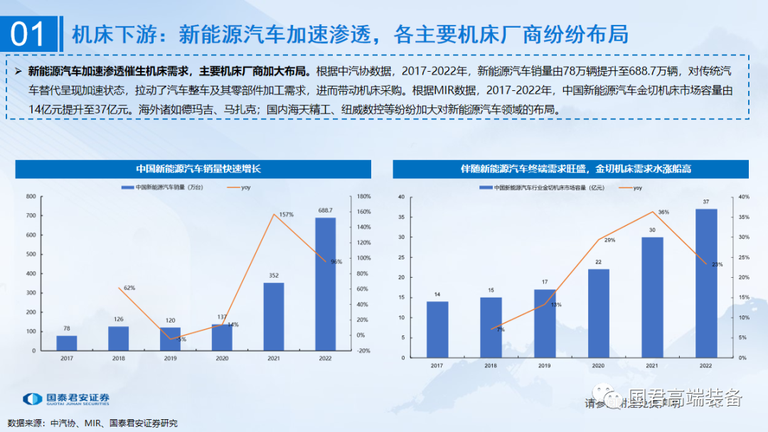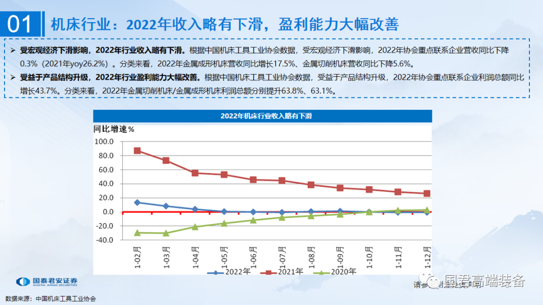 ▶ 国产机床产品结构持续升级,新能源等领域拉动机床增长。根据中国机床工具工业协会数据,2022年协会重点联系企业营收同比下降0.3%,利润总额同比提升43.7%。金属切削机床消费额1240.3亿元/-4.3%,产量57.2万台/-13.1%;金属成形机床消费额603.3亿元/+3.5%,产量18.3万台/-15.7%。综合行业营收下滑,利润逆势大幅增长以及消费额下降幅度小于产量小幅幅度,可推断出国产机床正逐步往高端化转型。国内新能源的蓬勃发展也拉动机床行业快速增长,主要增长驱动来自新能源汽车与风电领域。