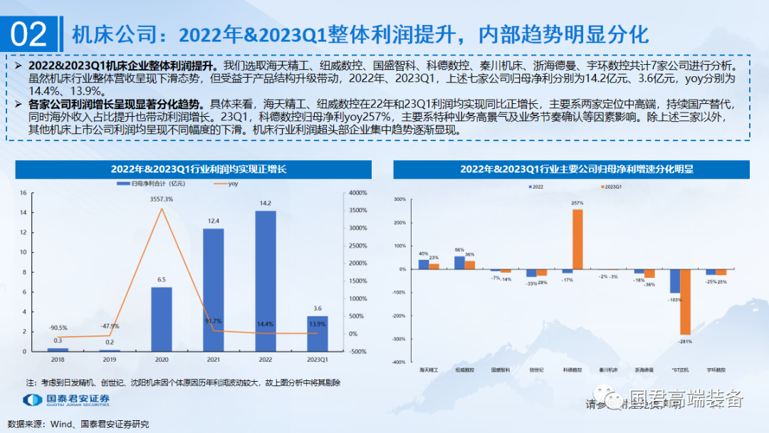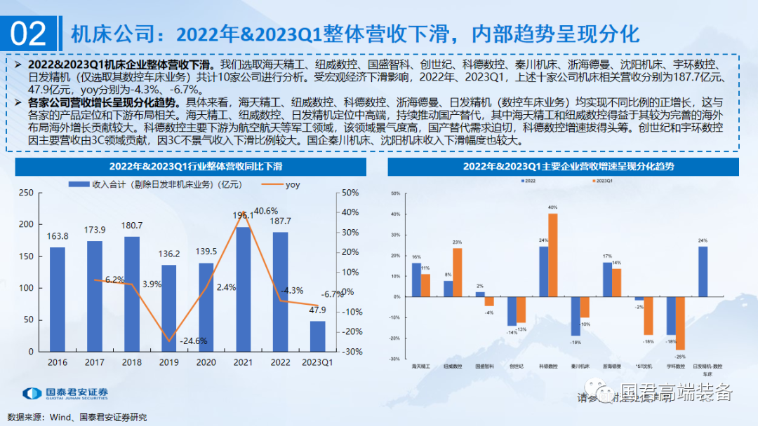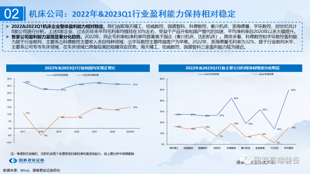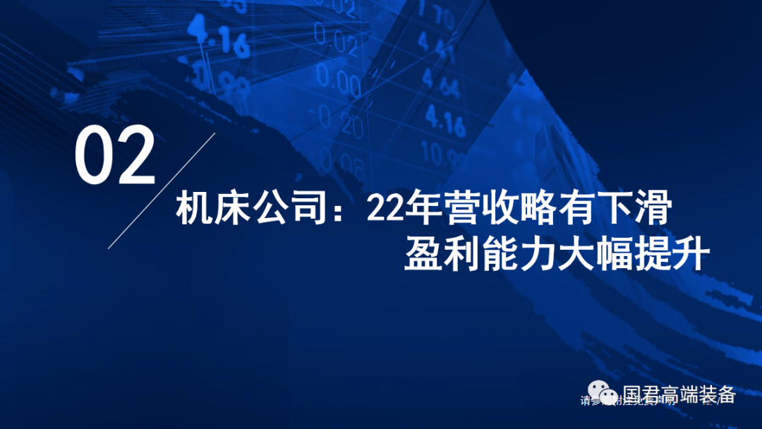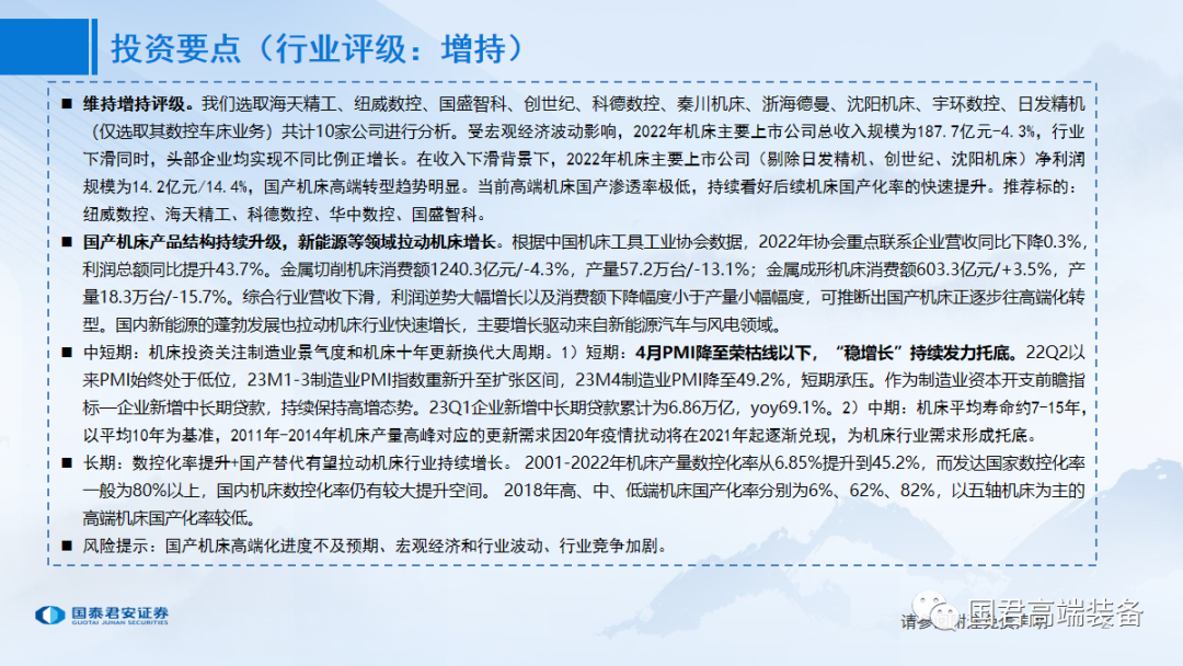 ▶ 维持增持评级。我们选取海天精工、纽威数控、国盛智科、创世纪、科德数控、秦川机床、浙海德曼、沈阳机床、宇环数控、日发精机(仅选取其数控车床业务)共计10家公司进行分析。受宏观经济波动影响,2022年机床主要上市公司总收入规模为187.7亿元-4.3%,行业下滑同时,头部企业均实现不同比例正增长。在收入下滑背景下,2022年机床主要上市公司(剔除日发精机、创世纪、沈阳机床)净利润规模为14.2亿元/14.4%,国产机床高端转型趋势明显。当前高端机床国产渗透率极低,持续看好后续机床国产化率的快速提升。推荐标的:纽威数控、海天精工、科德数控、华中数控、国盛智科。