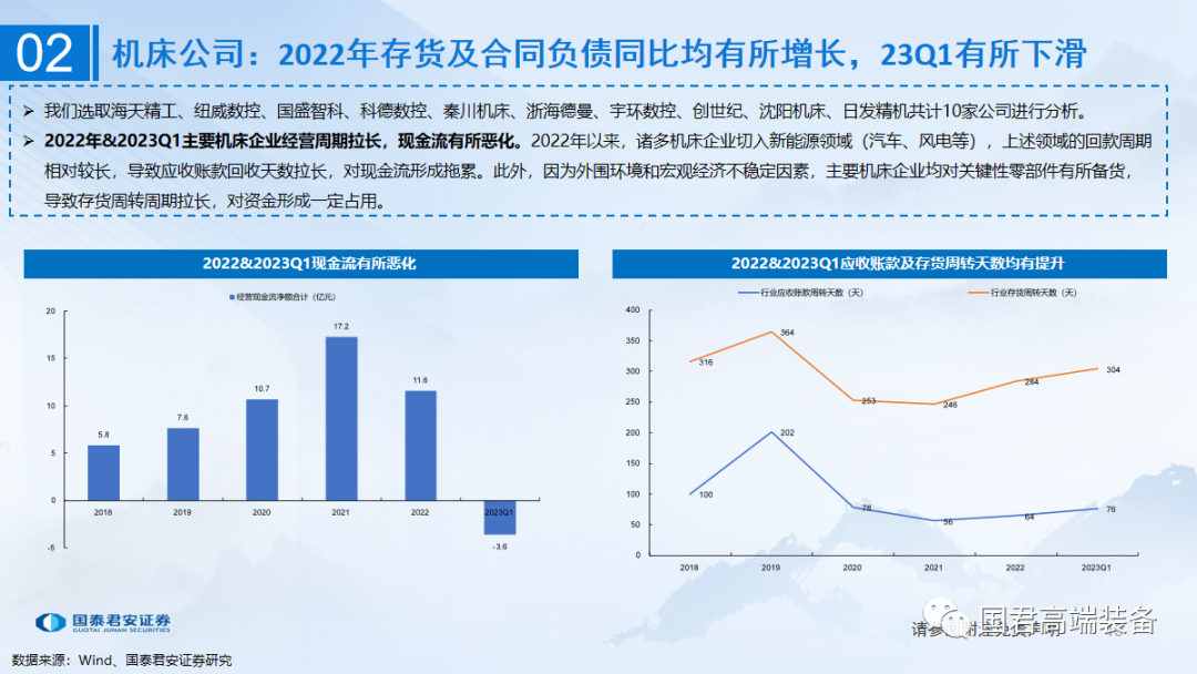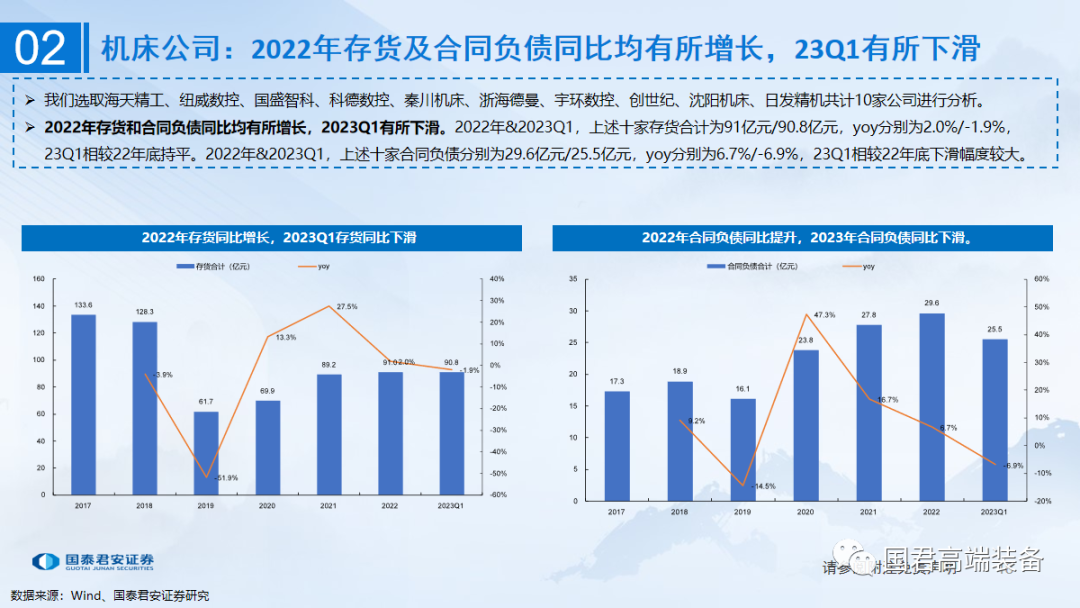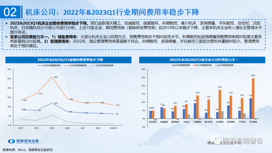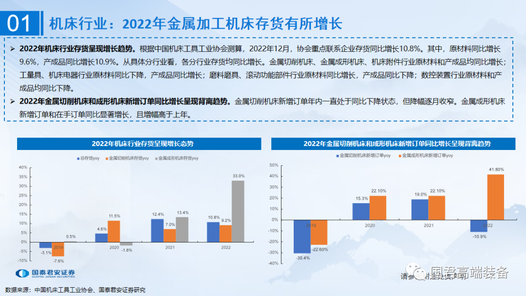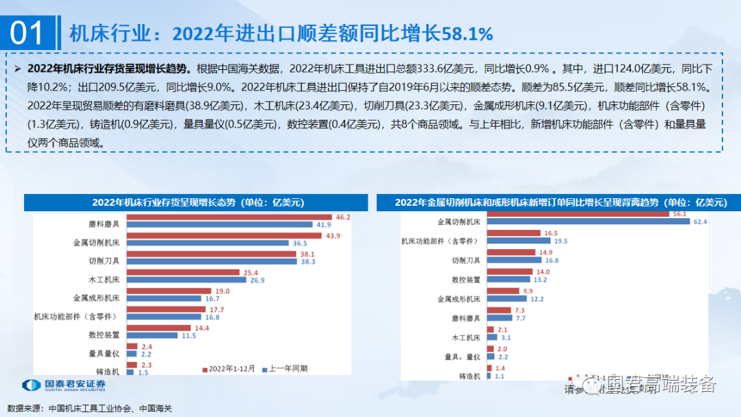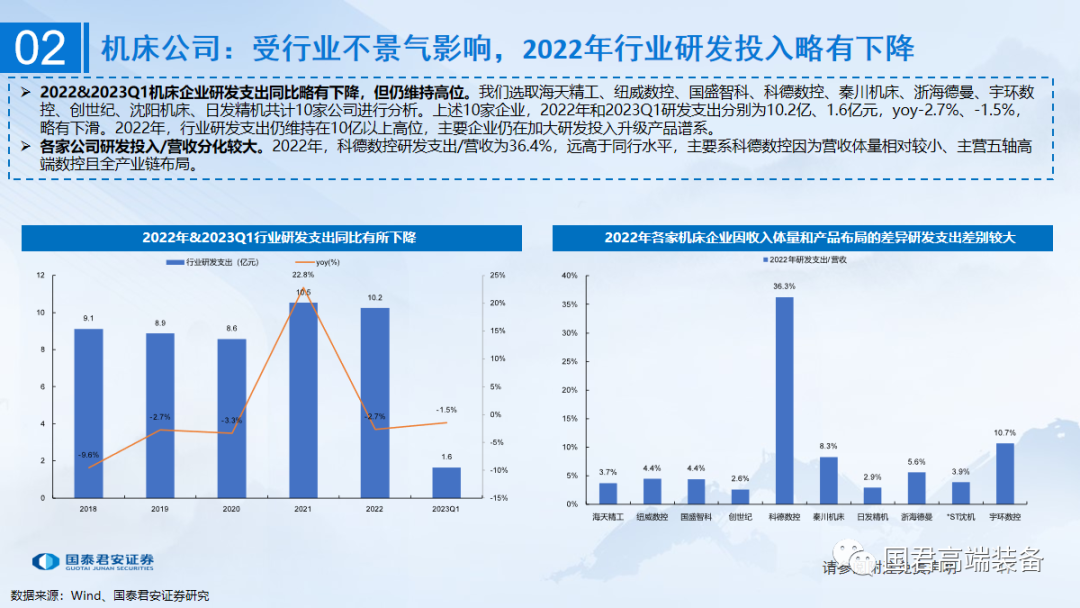 ▶ 维持增持评级。我们选取海天精工、纽威数控、国盛智科、创世纪、科德数控、秦川机床、浙海德曼、沈阳机床、宇环数控、日发精机(仅选取其数控车床业务)共计10家公司进行分析。受宏观经济波动影响,2022年机床主要上市公司总收入规模为187.7亿元-4.3%,行业下滑同时,头部企业均实现不同比例正增长。在收入下滑背景下,2022年机床主要上市公司(剔除日发精机、创世纪、沈阳机床)净利润规模为14.2亿元/14.4%,国产机床高端转型趋势明显。当前高端机床国产渗透率极低,持续看好后续机床国产化率的快速提升。推荐标的:纽威数控、海天精工、科德数控、华中数控、国盛智科。