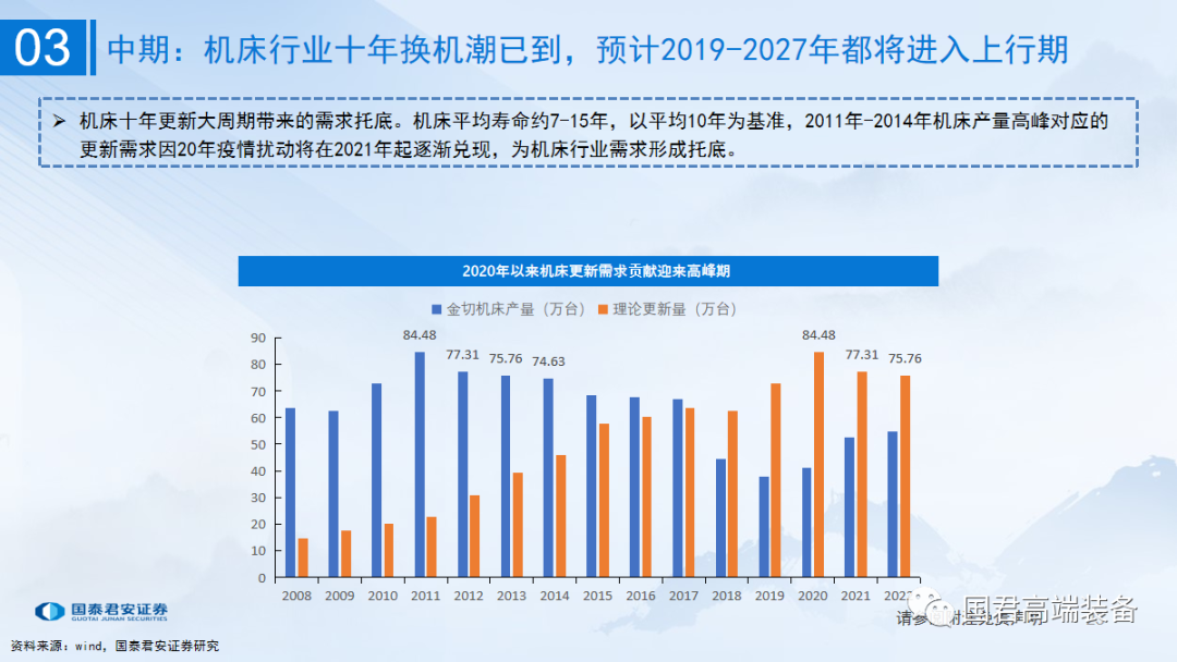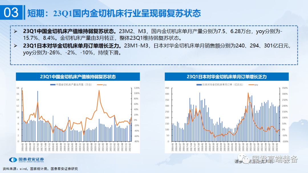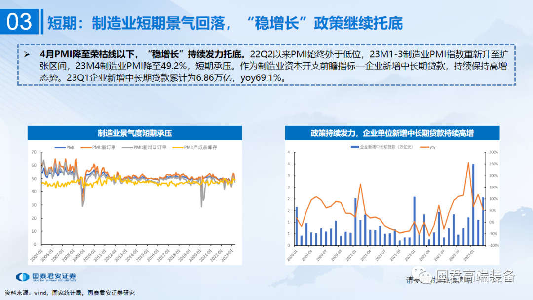 ▶ 中短期:机床投资关注制造业景气度和机床十年更新换代大周期。1)短期:4月PMI降至荣枯线以下,“稳增长”持续发力托底。22Q2以来PMI始终处于低位,23M1-3制造业PMI指数重新升至扩张区间,23M4制造业PMI降至49.2%,短期承压。作为制造业资本开支前瞻指标—企业新增中长期贷款,持续保持高增态势。23Q1企业新增中长期贷款累计为6.86万亿,yoy69.1%。2)中期:机床平均寿命约7-15年,以平均10年为基准,2011年-2014年机床产量高峰对应的更新需求因20年疫情扰动将在2021年起逐渐兑现,为机床行业需求形成托底。