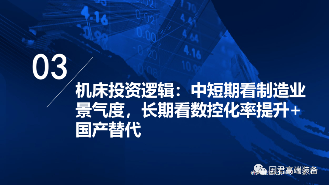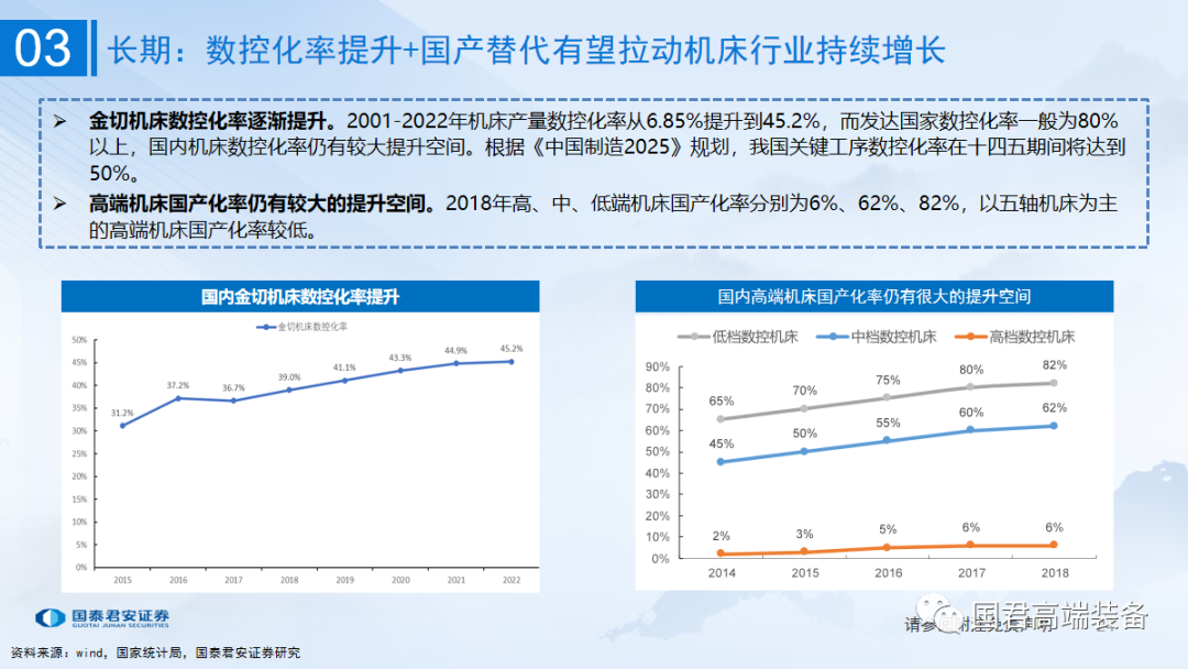 ▶ 长期:数控化率提升+国产替代有望拉动机床行业持续增长。2001-2022年机床产量数控化率从6.85%提升到45.2%,而发达国家数控化率一般为80%以上,国内机床数控化率仍有较大提升空间。2018年高、中、低端机床国产化率分别为6%、62%、82%,以五轴机床为主的高端机床国产化率较低。