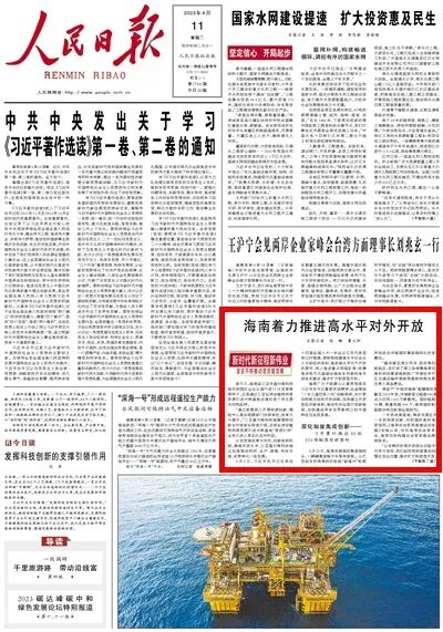 4月11日,《人民日报》第01版刊发文章《海南着力推进高水平对外开放》,版面图及全文如下: