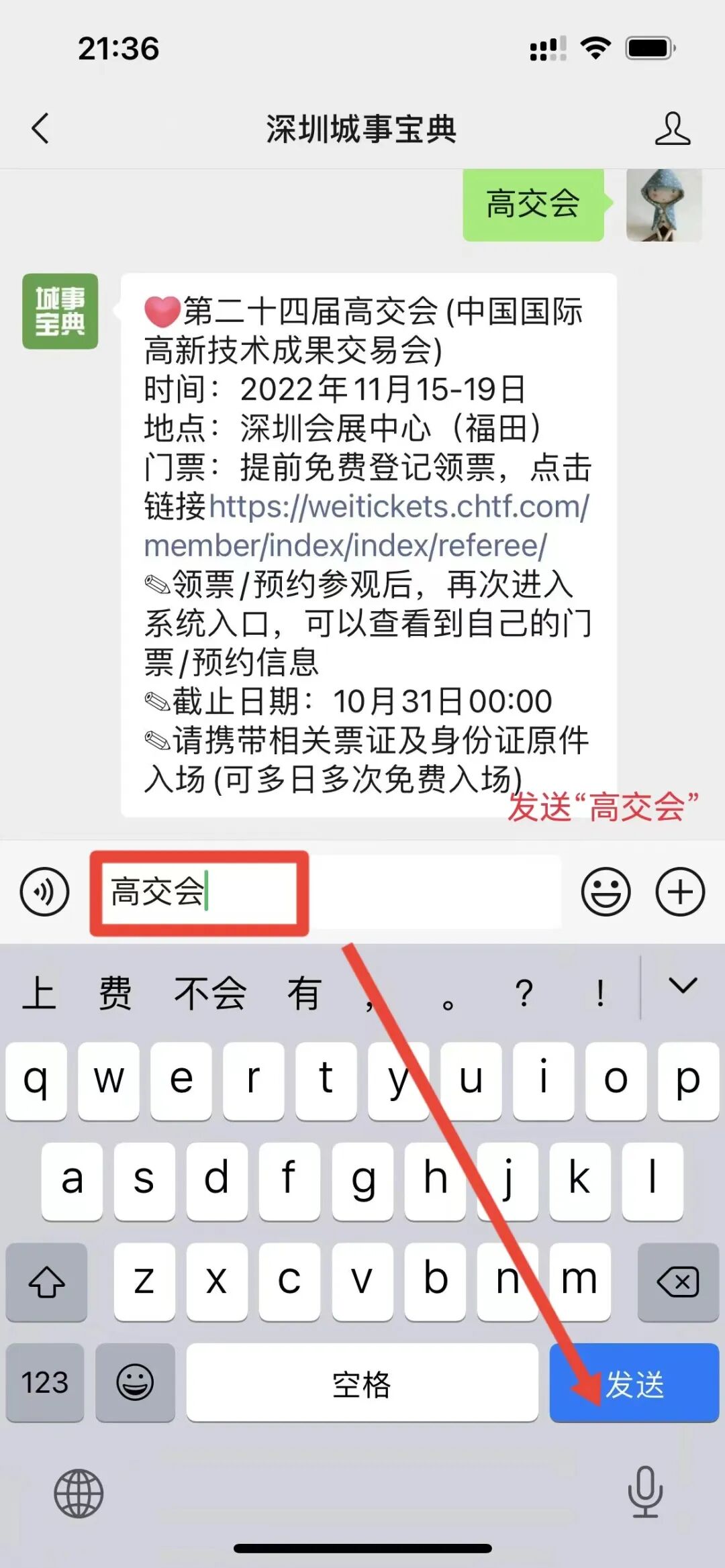 发送【高交会】即可进入领票页面